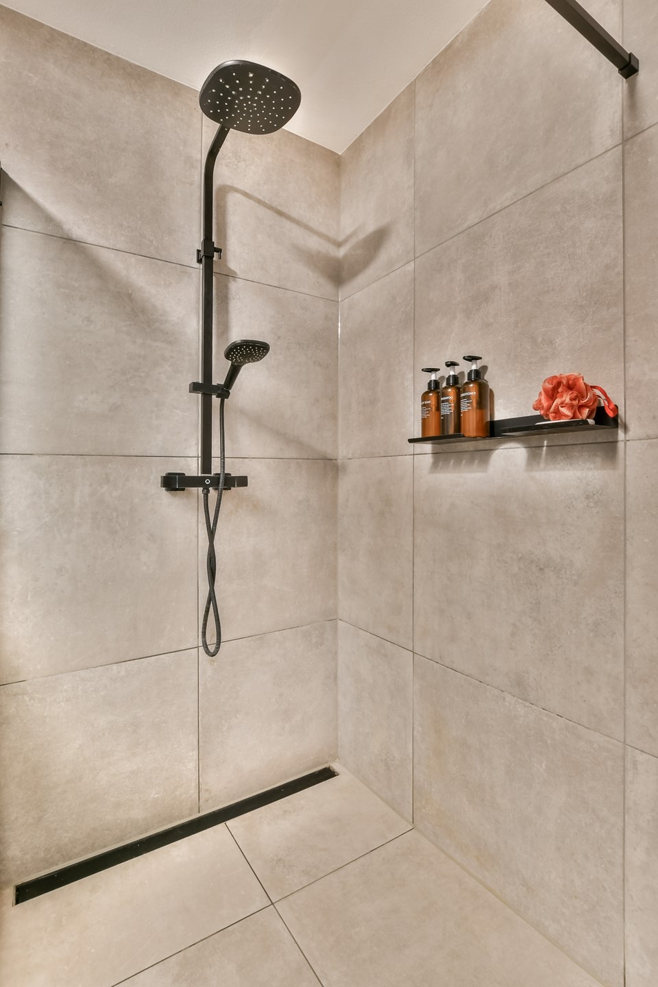 Vanuit de hal zijn de badkamer en het toilet toegankelijk. Beide ruimtes zijn in dezelfde stijl gemoderniseerd.