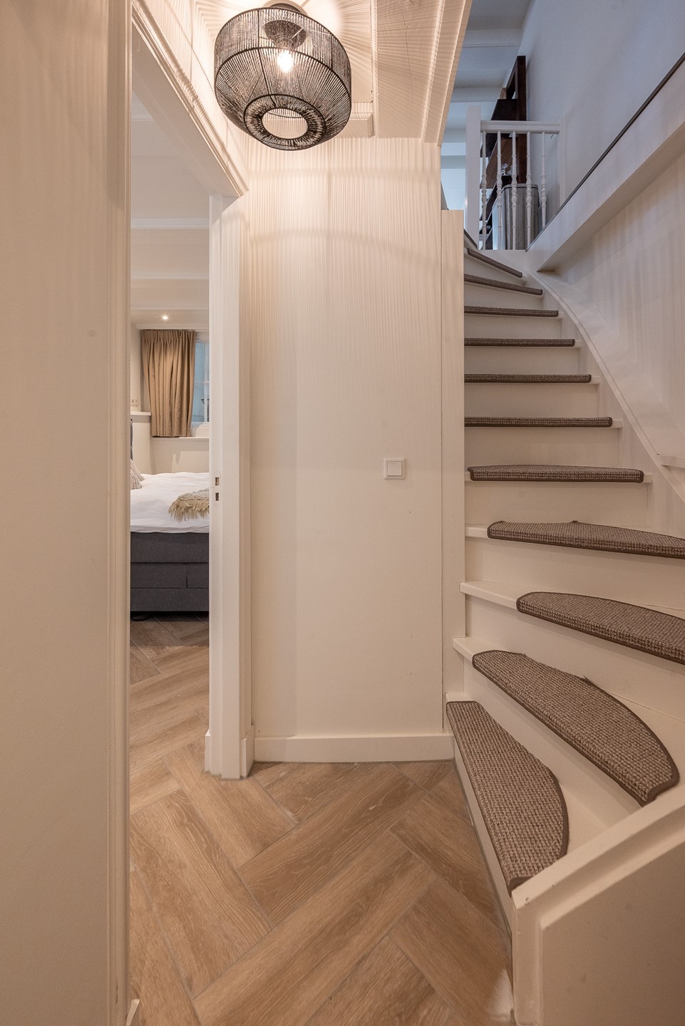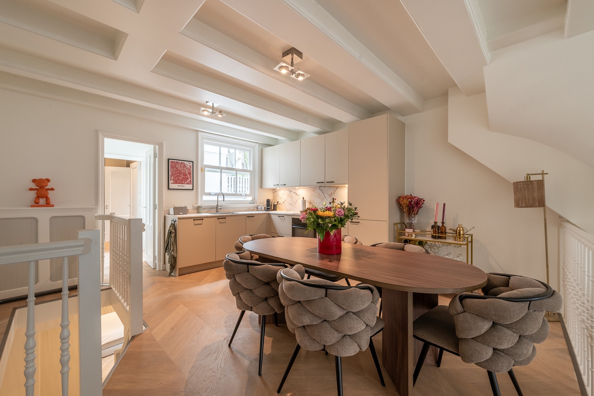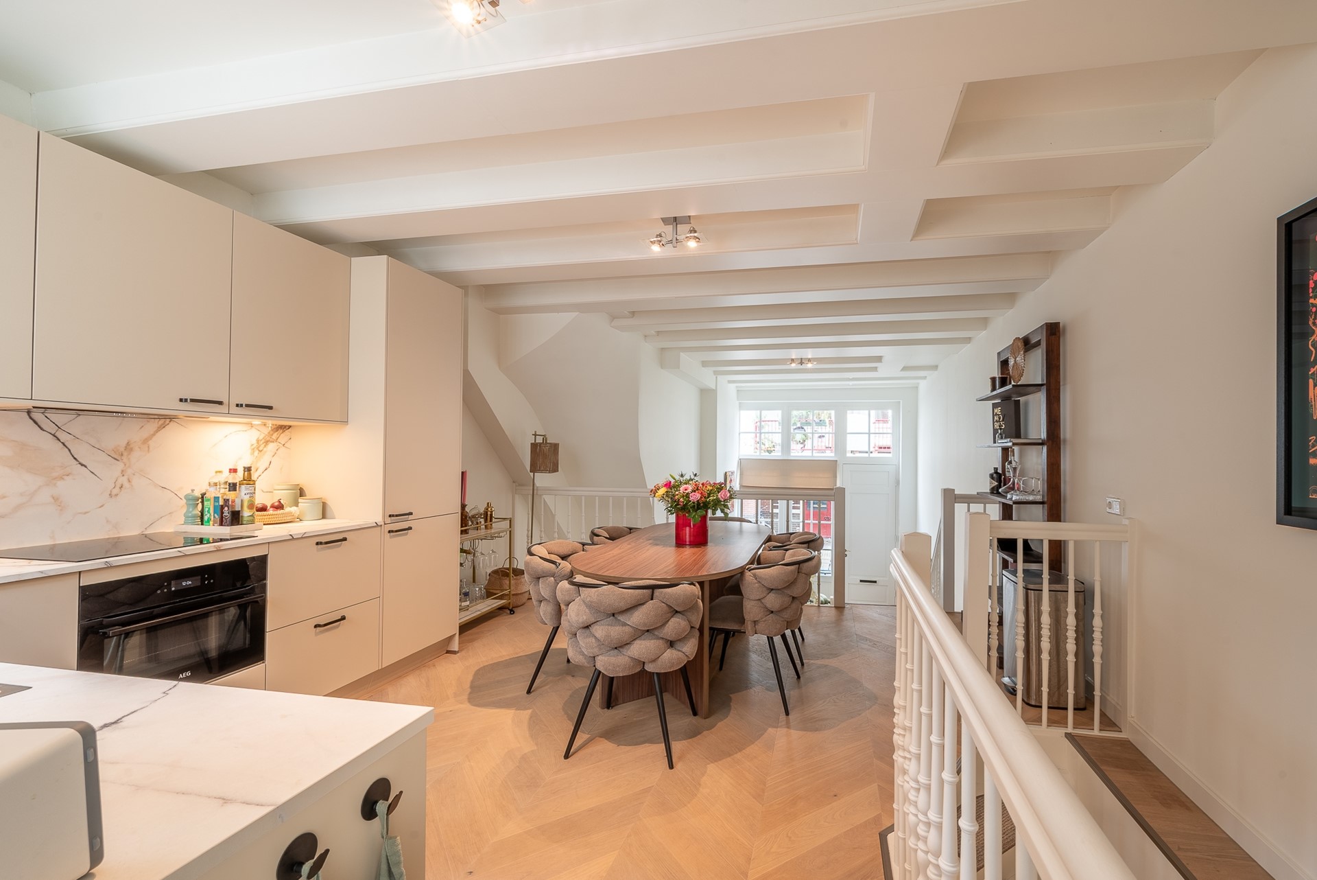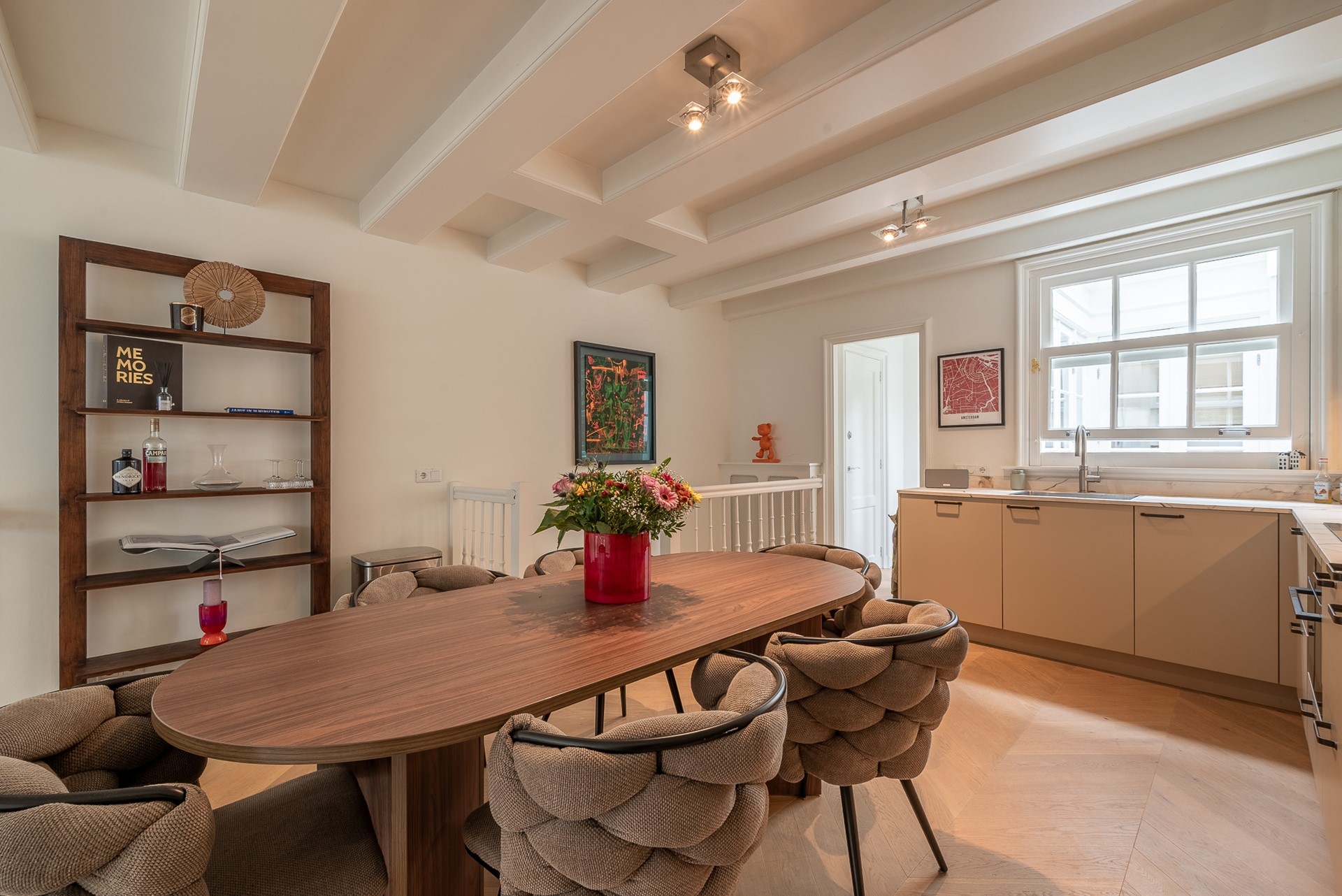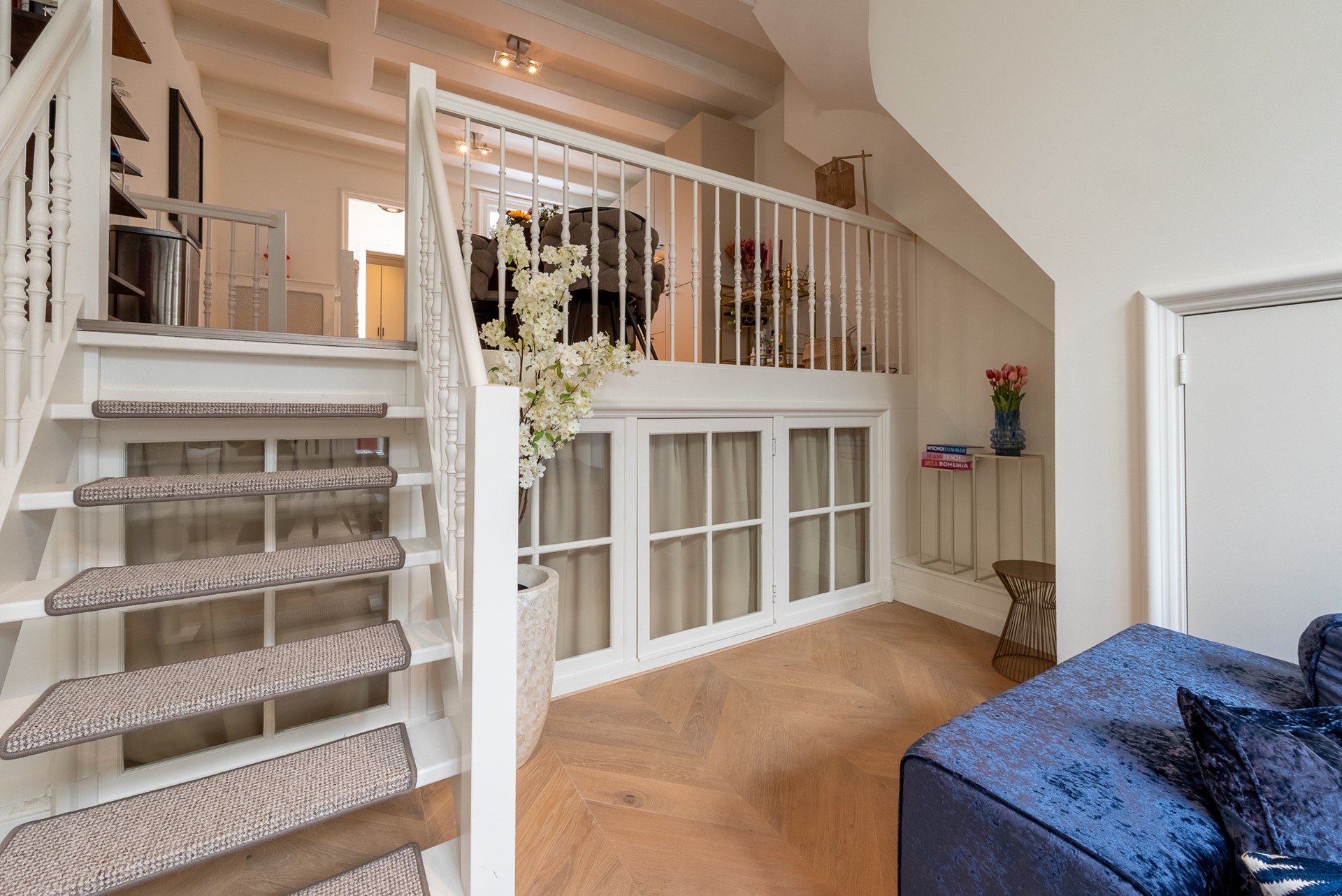 Via the stairs you reach the upper level open-plan kitchen equipped with a Quooker tap, combination oven/microwave, built-in refrigerator and dishwasher.