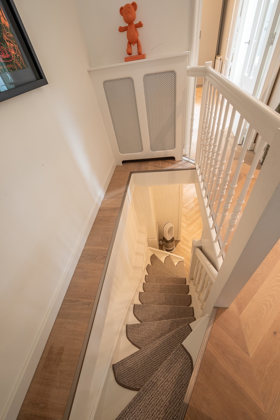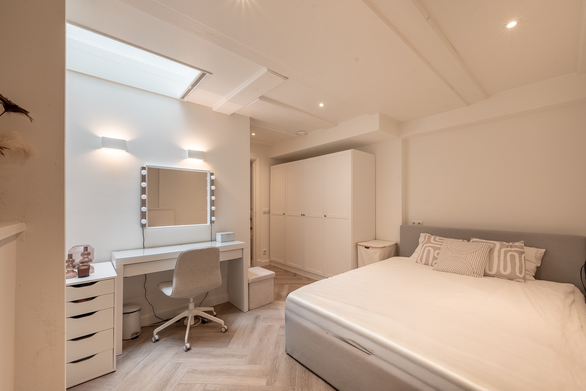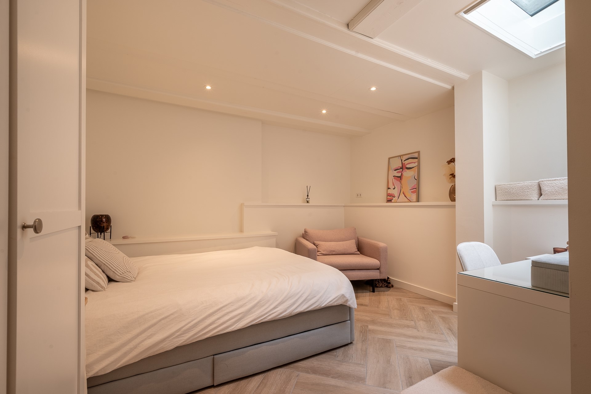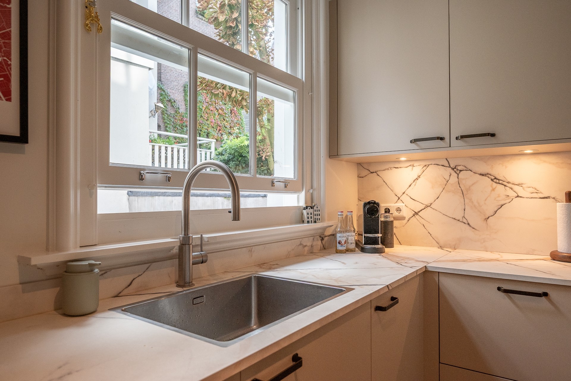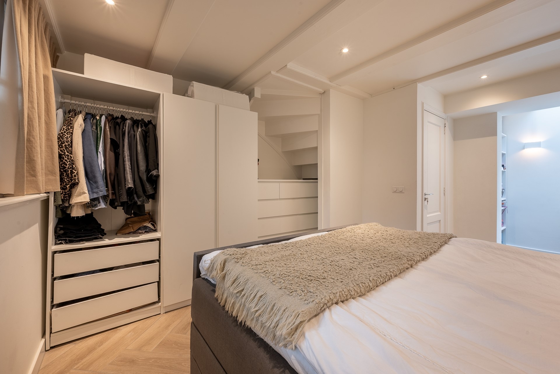 Via the stairs you reach the upper level open-plan kitchen equipped with a Quooker tap, combination oven/microwave, built-in refrigerator and dishwasher.