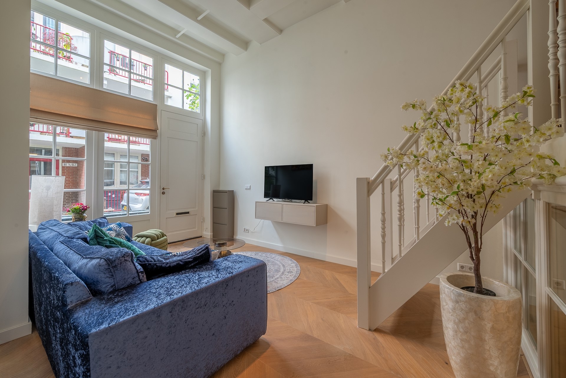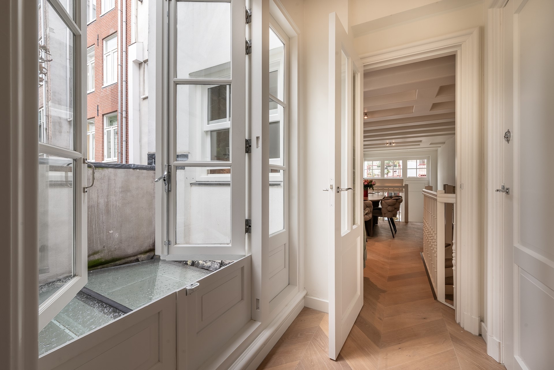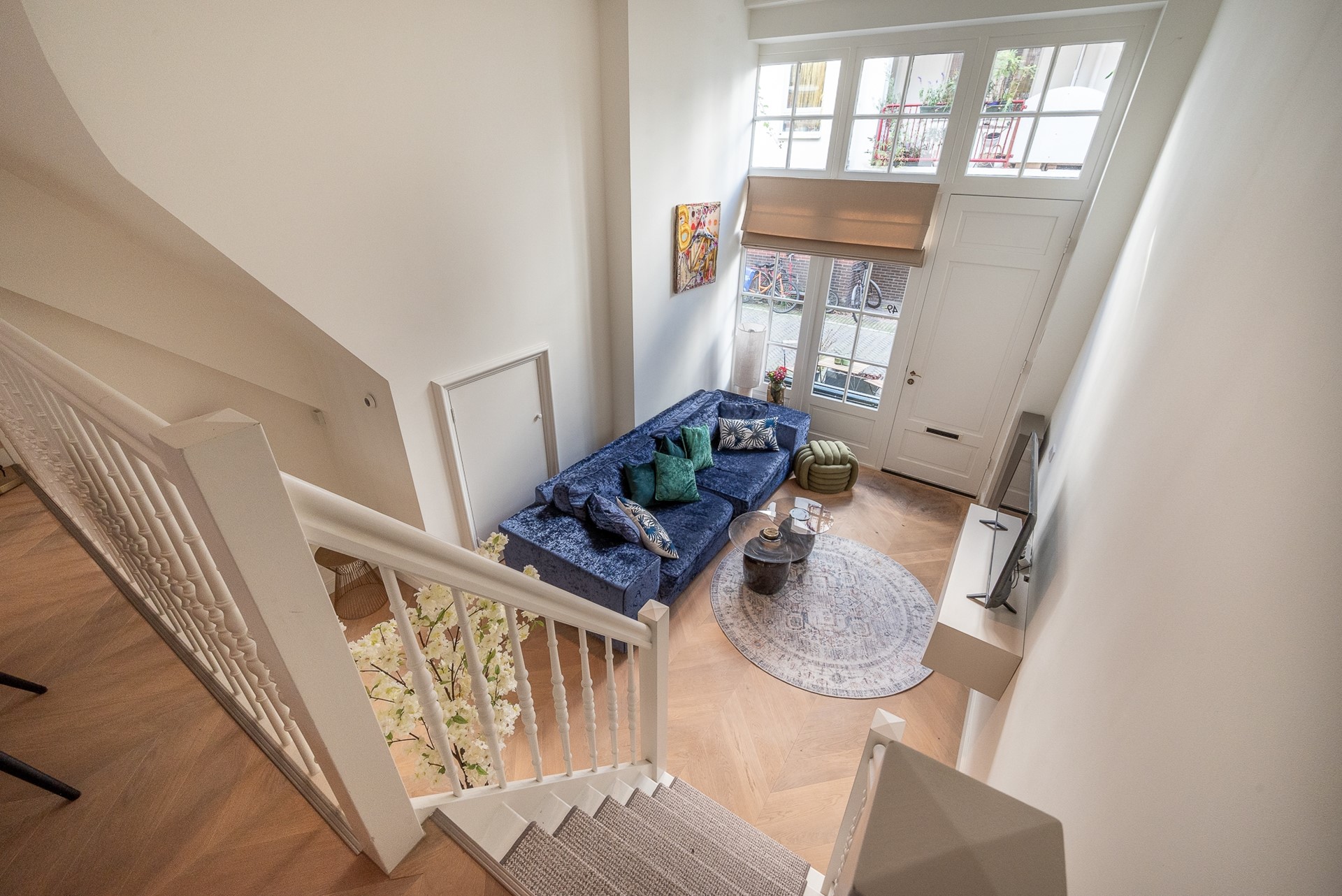 Deze zorgen voor veel natuurlijk licht en contact met de levendige straat. De gerenoveerde woning is voorzien van vloerverwarming en dubbel glas.