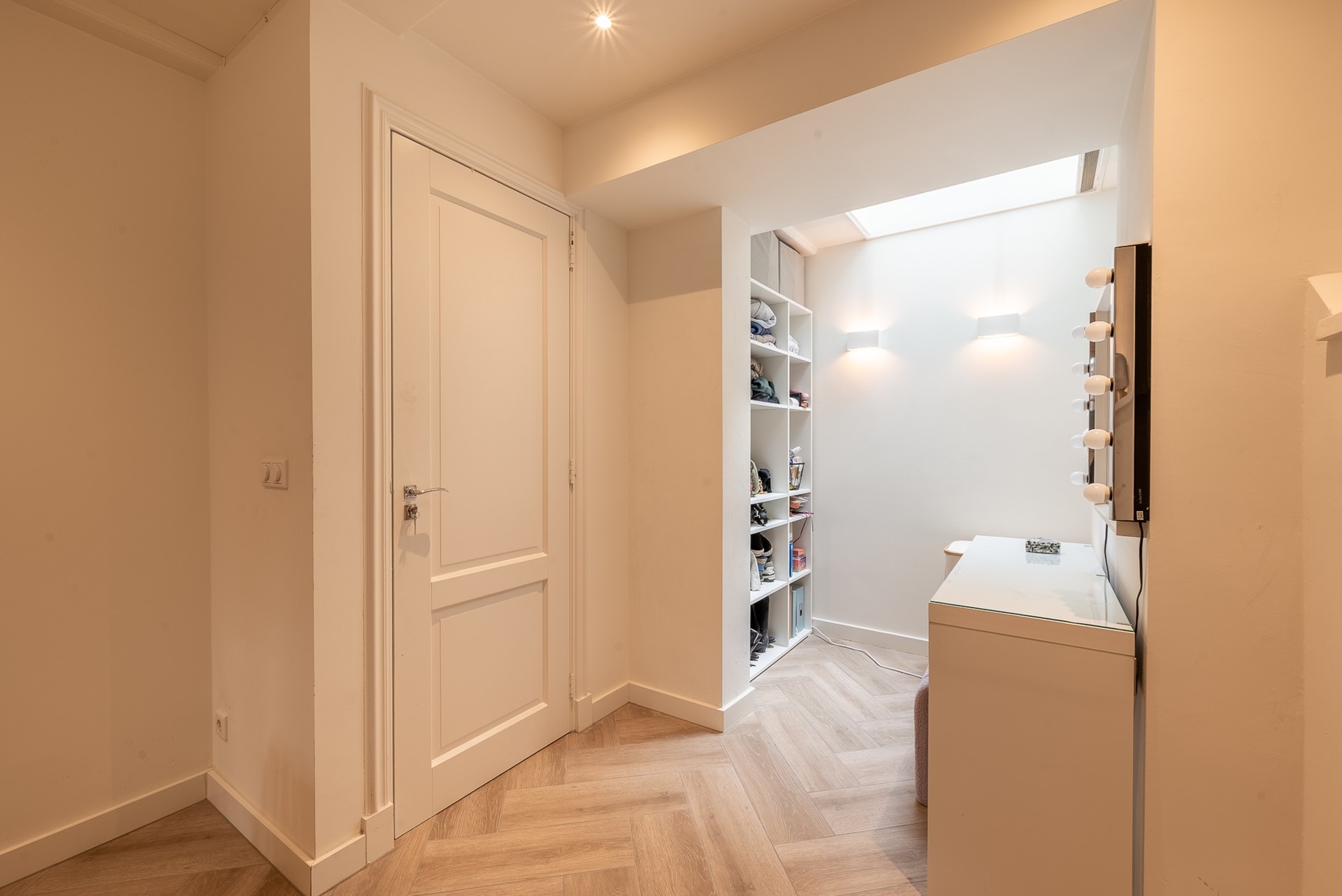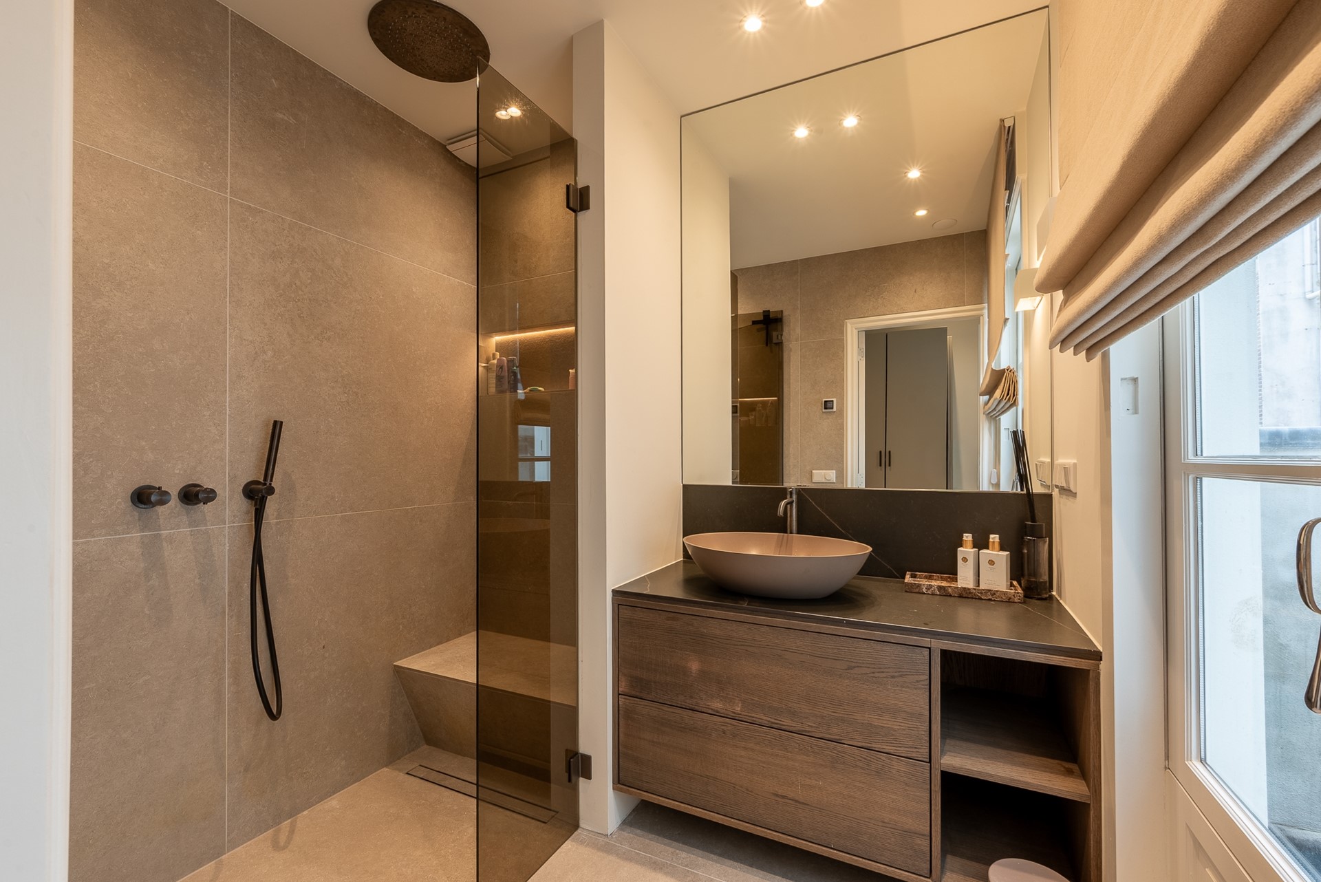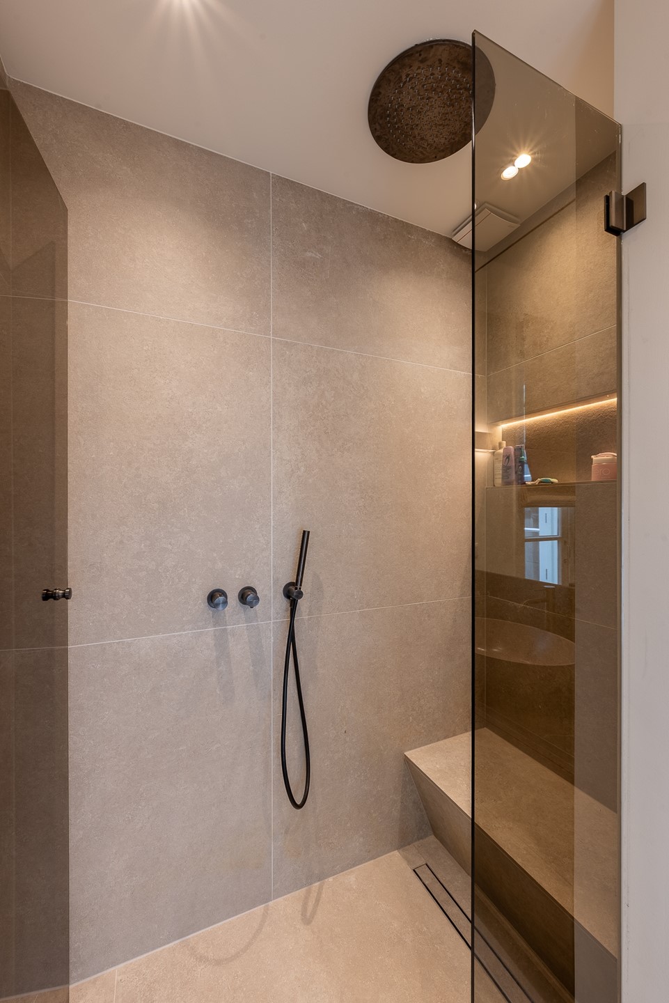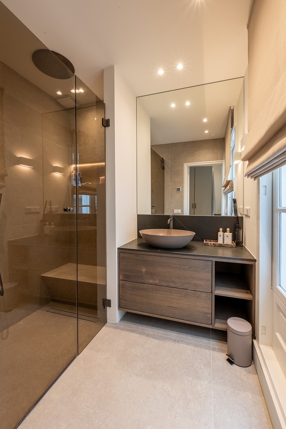 Vanuit deze ruimte is de moderne badkamer te bereiken met wastafel en comfortabele inloopdouche.