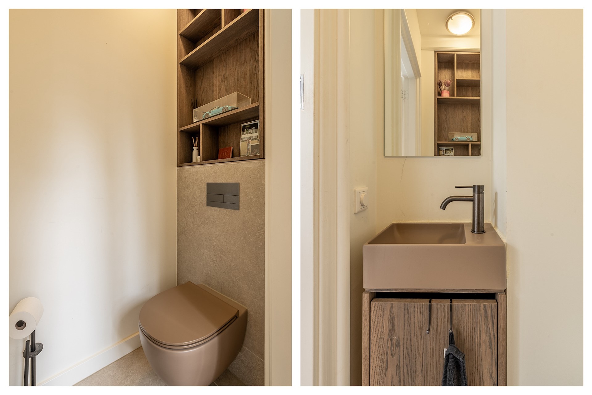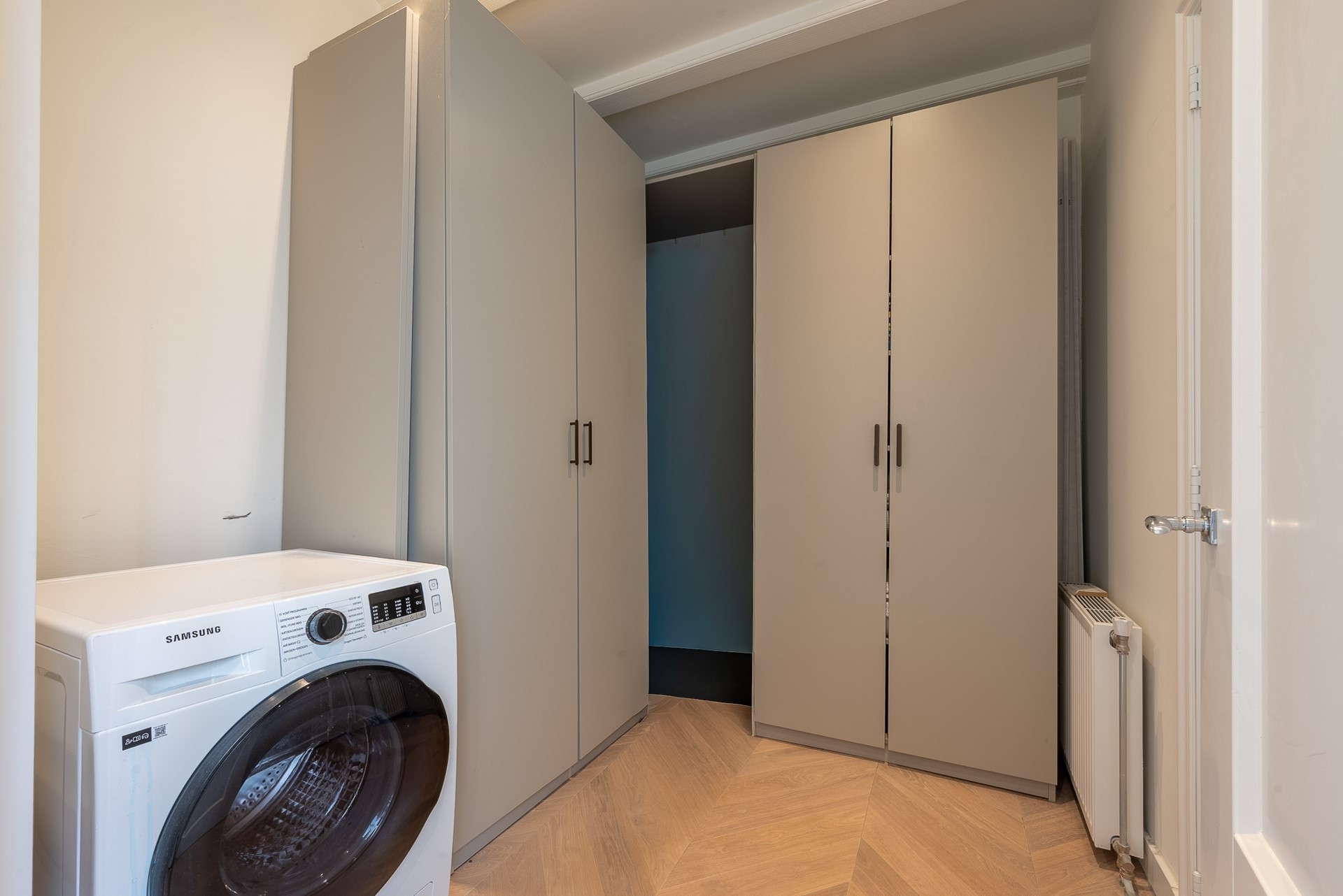 Aan de achterzijde van het appartement bevindt zich het separate toilet, wasruimte met wasmachine-aansluiting en voldoende kastruimte.