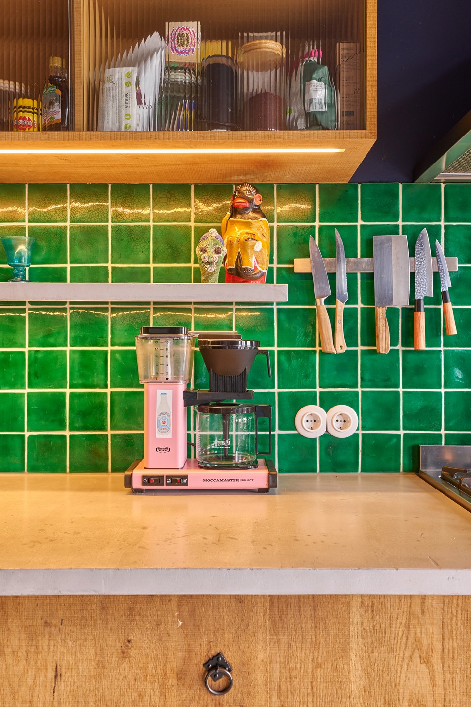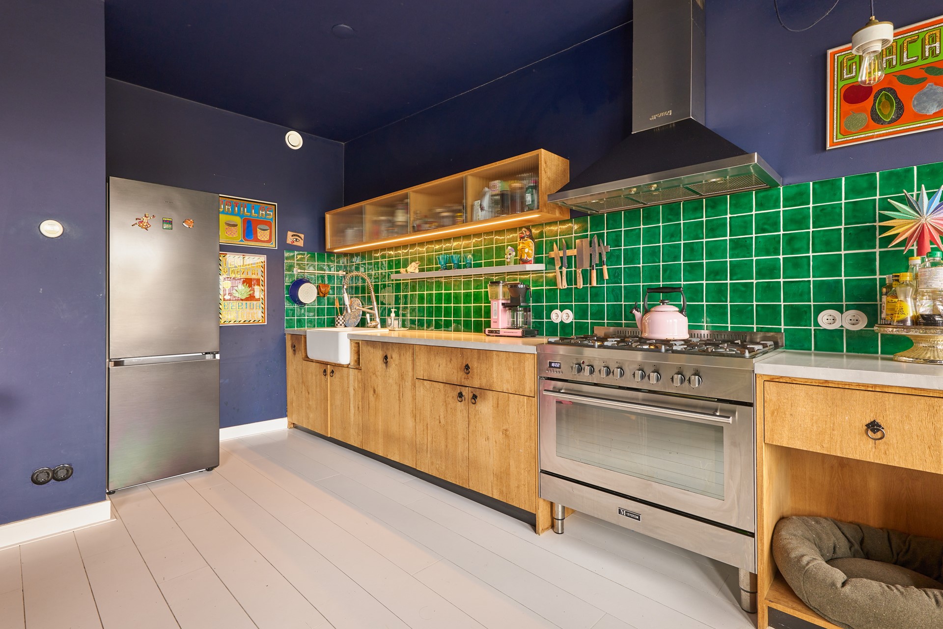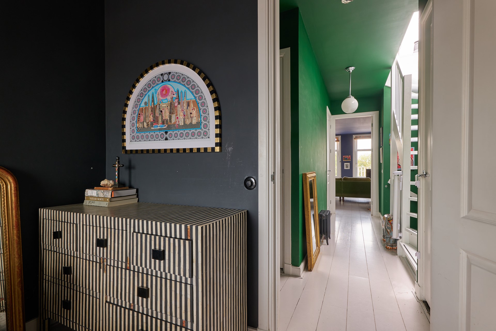 The apartment has high ceilings and enjoys plenty of natural light through the large windows and skylights, surrounded on three sides with views over the Singelgracht canal. The entire home is finished in a Maximalist style with bohemian British heritage roots, decorated with a bold colour-drenched paint approach in each room with designer paint from 'Farrow & Ball' and 'Little Greene’. The property features classic cast iron radiators that perfectly complement the character of the interior.