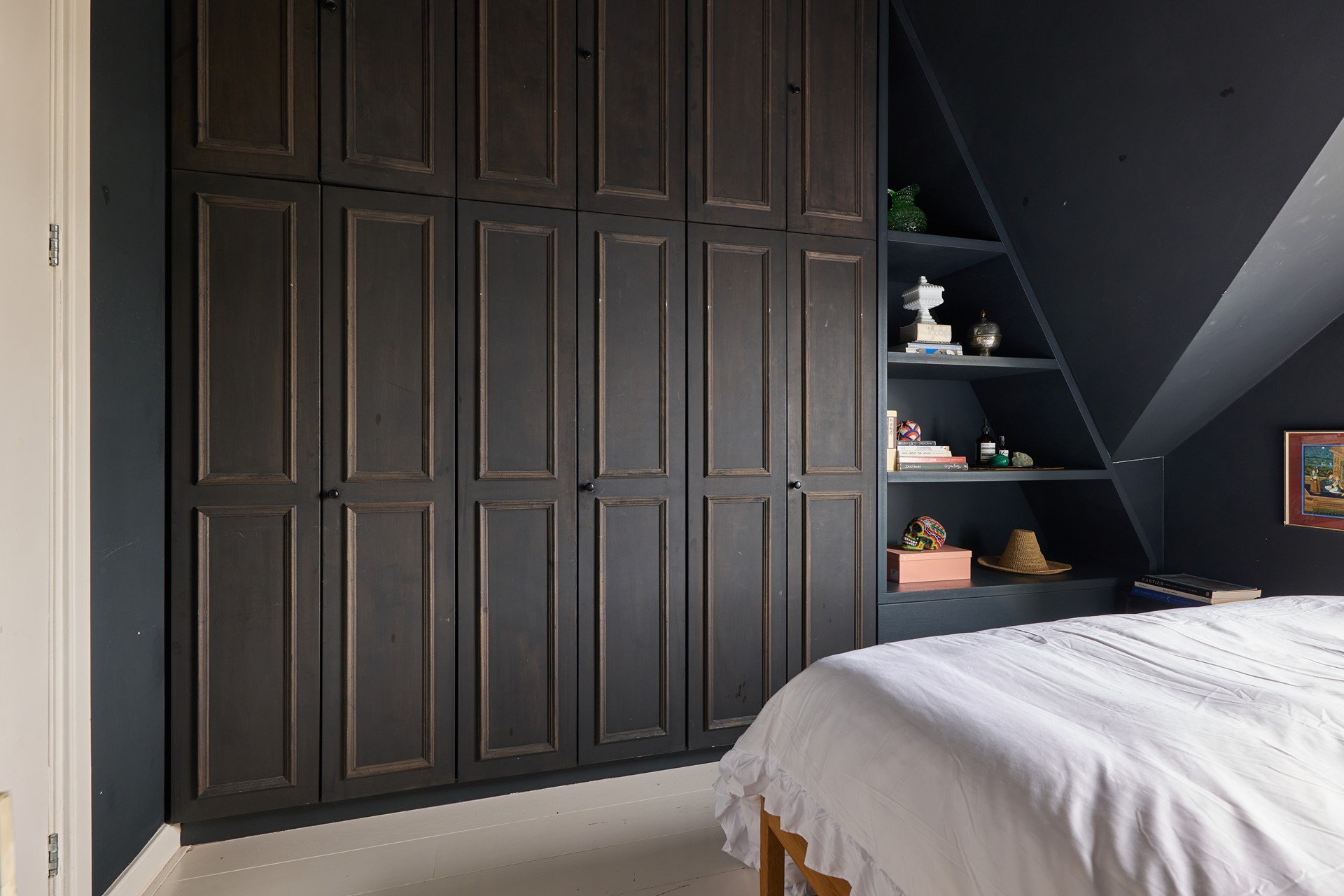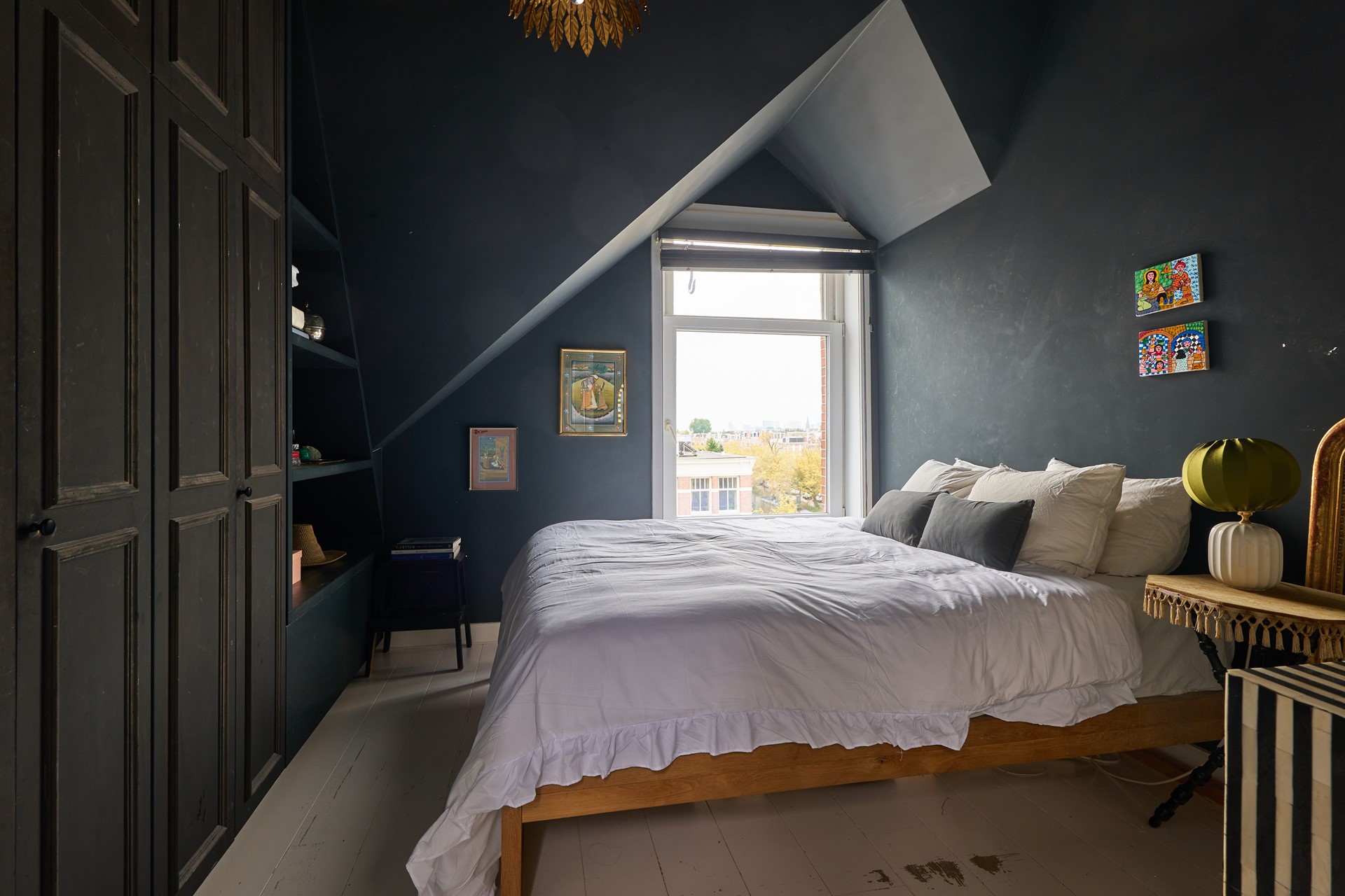 The master bedroom with morning sun and views of both the Rozengracht and Singelgracht canal features spacious built-in wardrobes with an antique look. The partially sloped ceiling and matte warm wall color give the space a playful and cozy atmosphere.