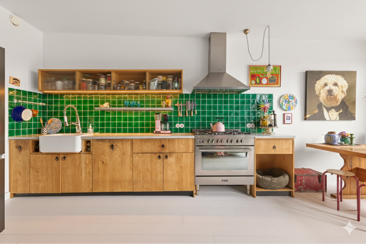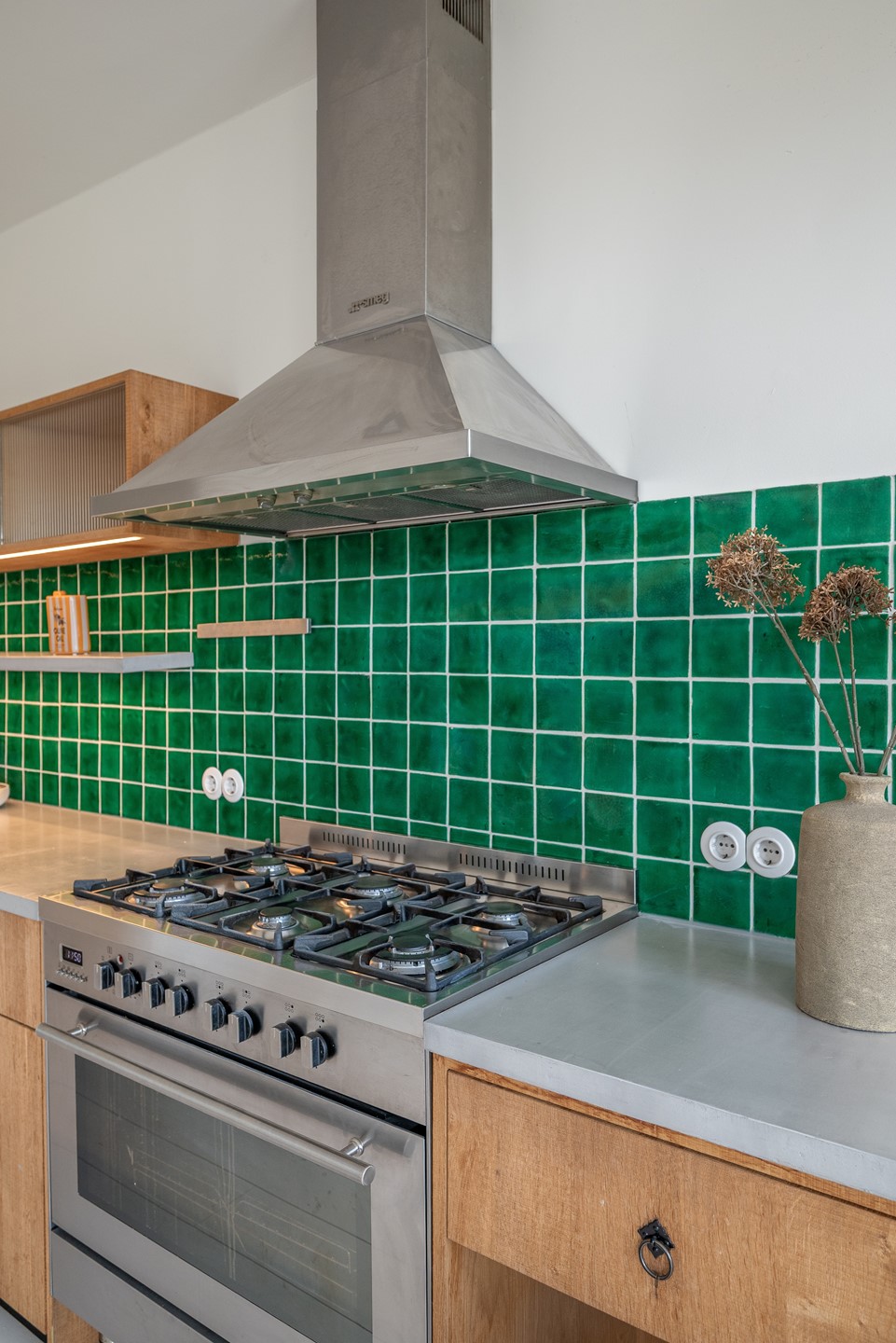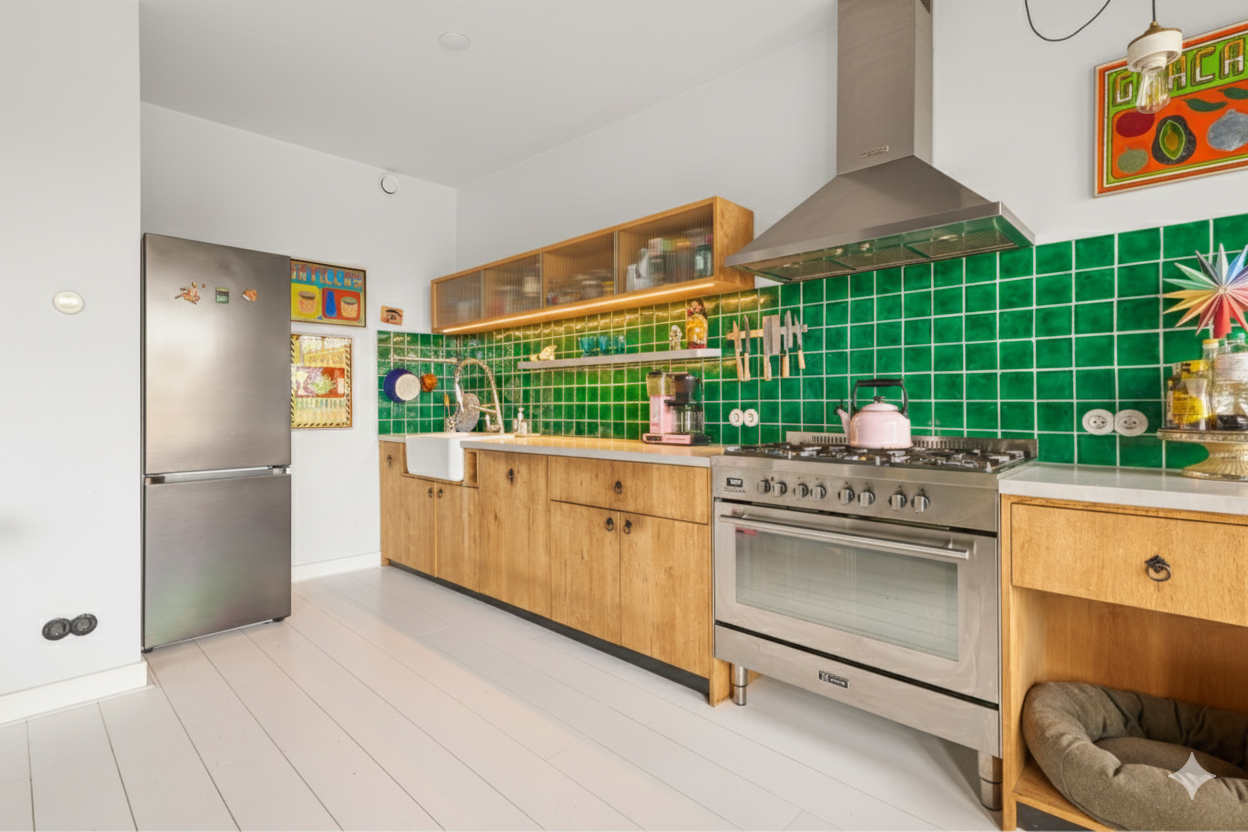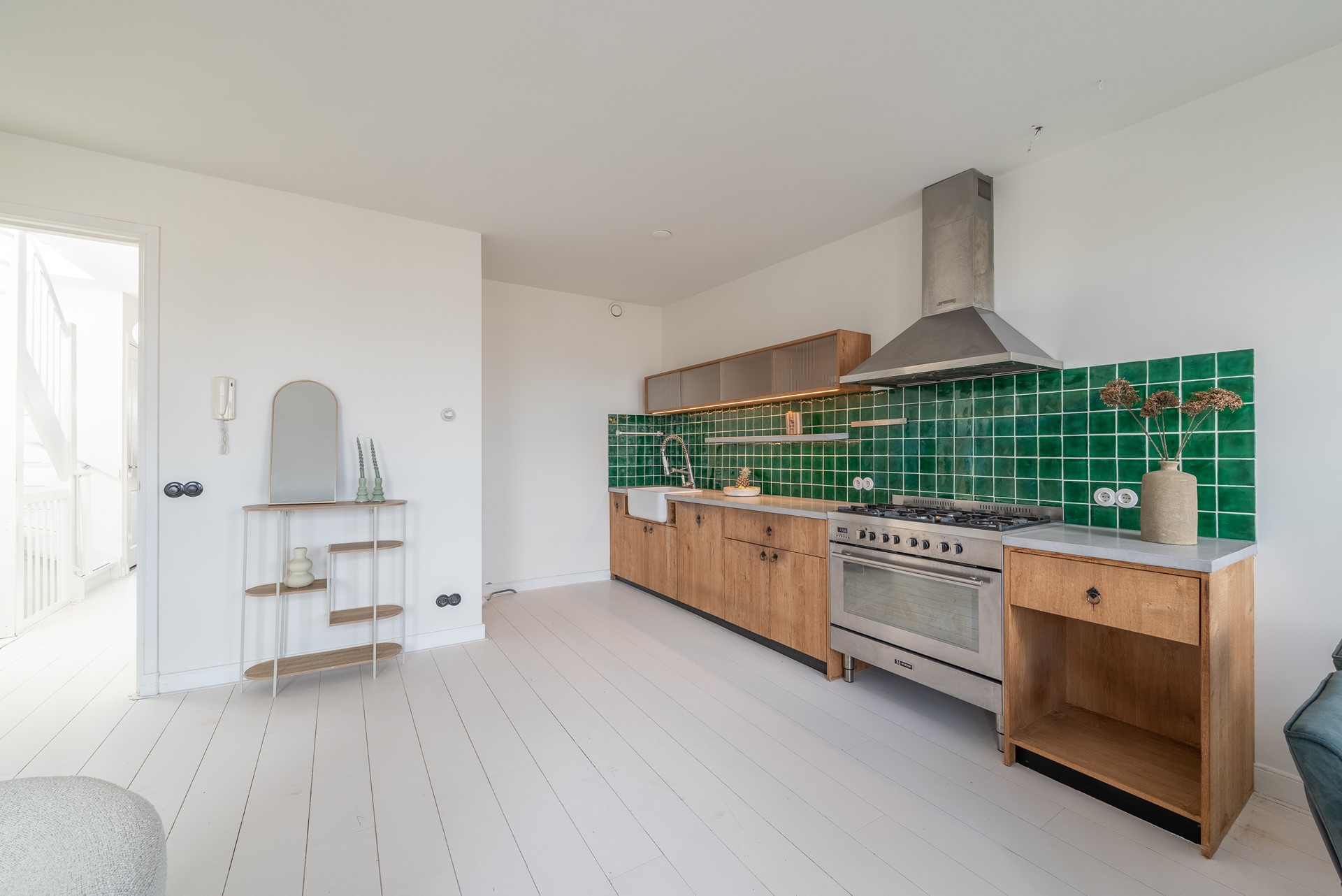 De woonkamer heeft een moderne open keuken die volledig is uitgerust met hoogwaardige apparatuur, waaronder een groot 6-pits fornuis met oven en inbouwvaatwasser.
