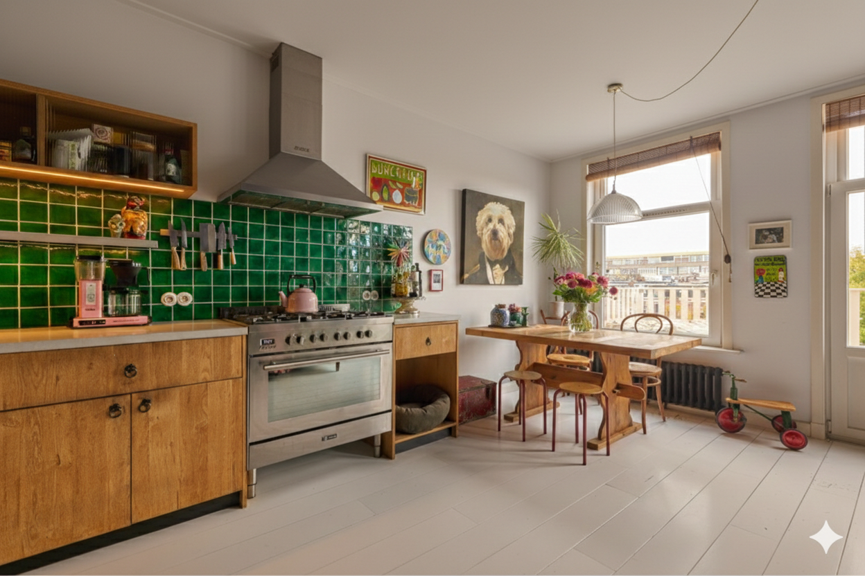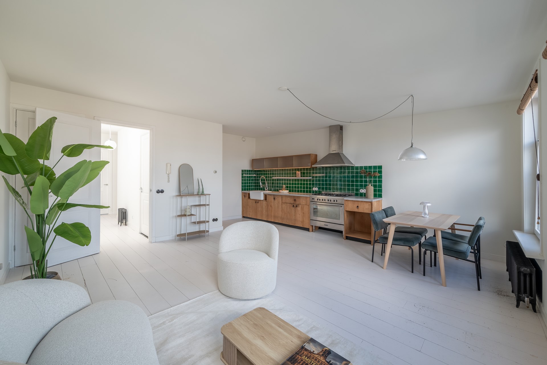 The apartment has high ceilings and enjoys plenty of natural light through the large windows and skylights, surrounded on three sides with views over the Singelgracht canal. The entire home is finished in a Maximalist style with bohemian British heritage roots. The property features classic cast iron radiators that perfectly complement the character of the interior.