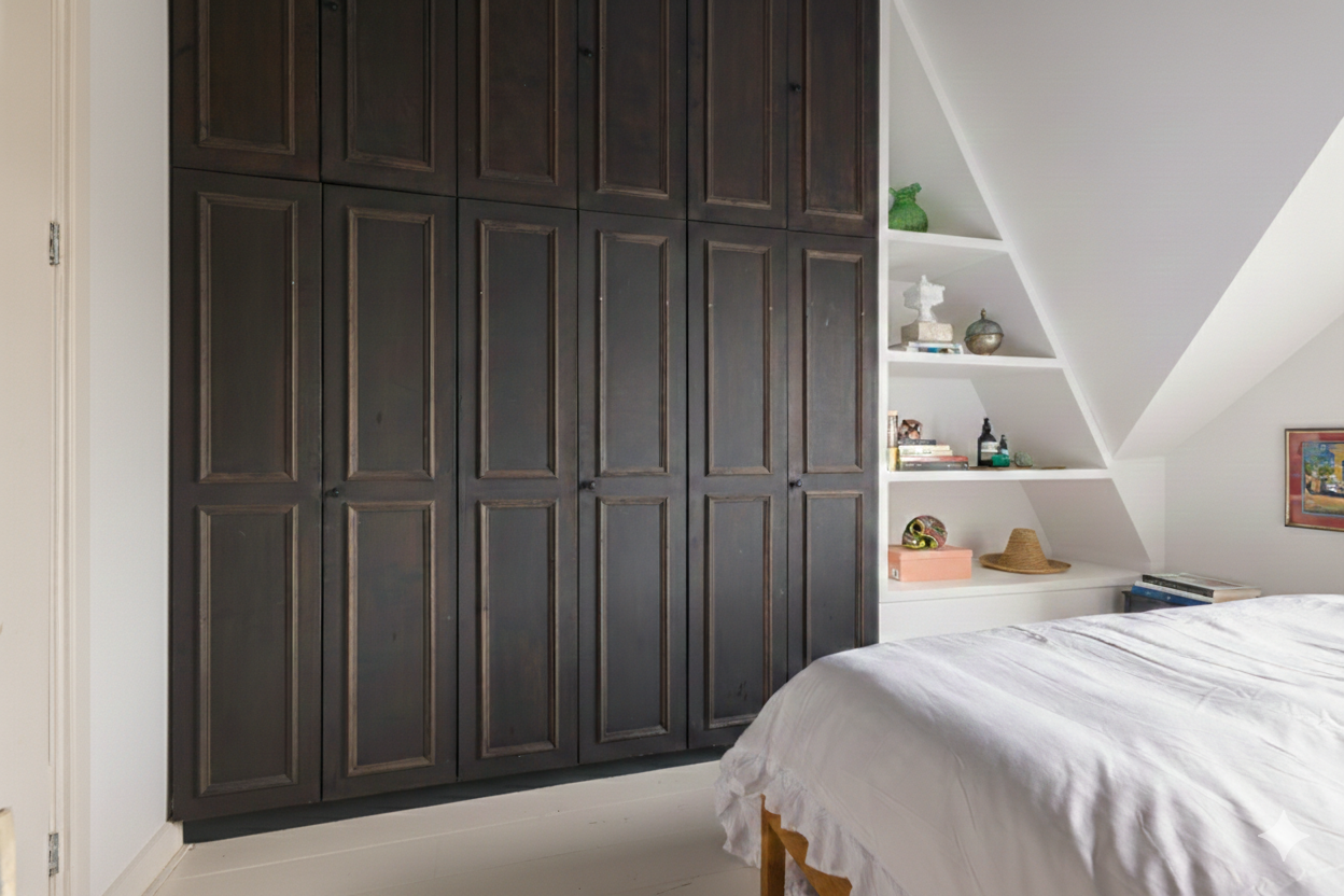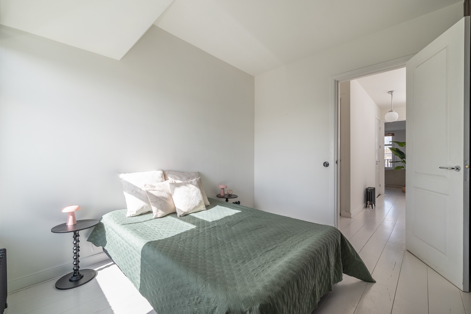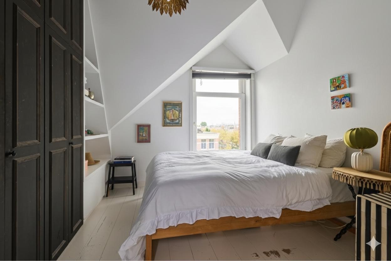 The master bedroom with morning sun and views of both the Rozengracht and Singelgracht canal features spacious built-in wardrobes with an antique look. The partially sloped ceiling gives the space a playful, cozy and bright atmosphere.