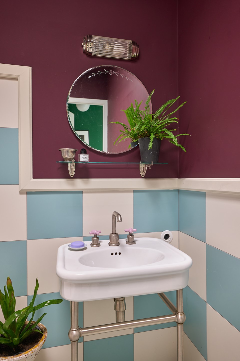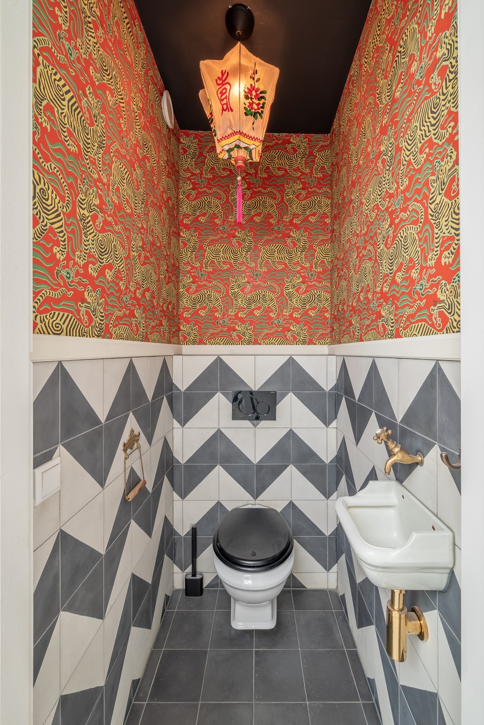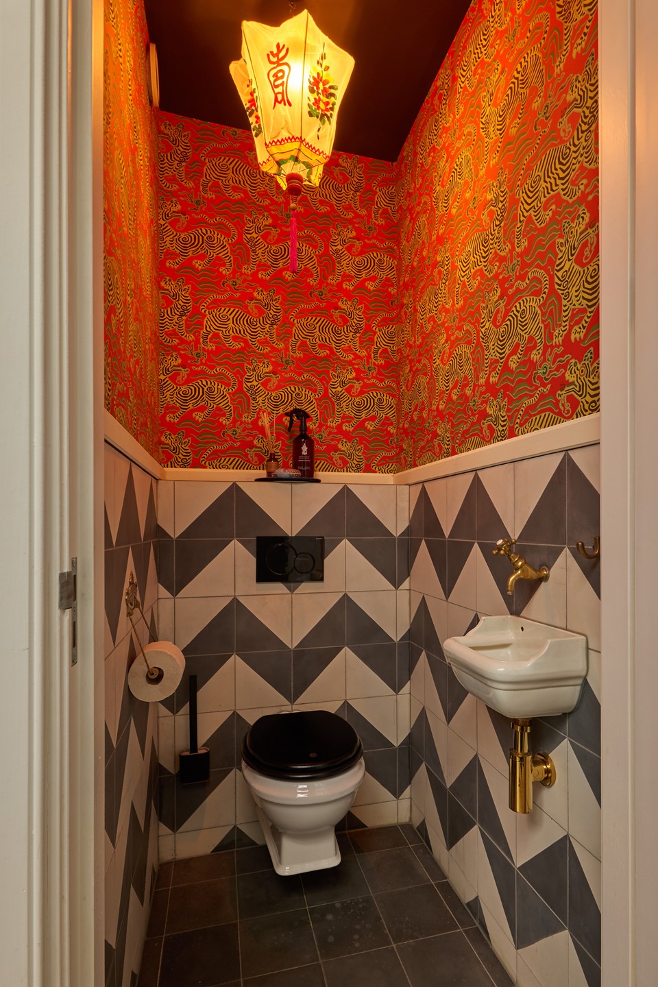 The separate toilet is decorated with red 'Clarence House' tiger wallpaper and an antique sink, giving this space a unique and distinctive character.