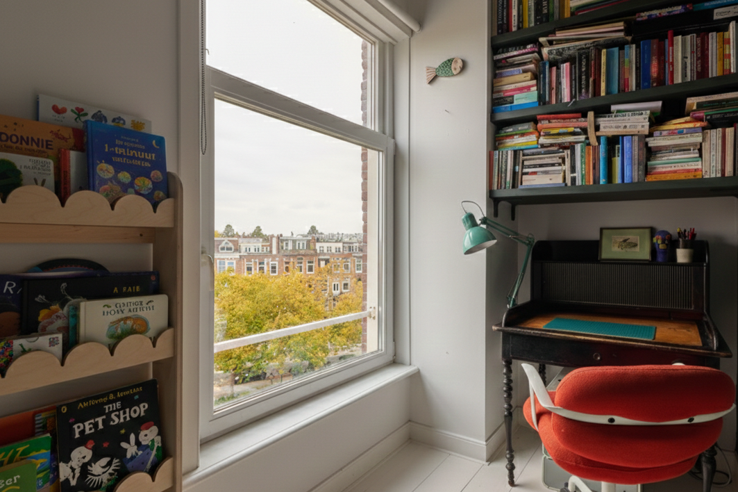 On the side of the apartment is the second bedroom, which can be combined with an office space. This room has a skylight for extra light, and from the high window frame you can also admire the Singelgracht canal.