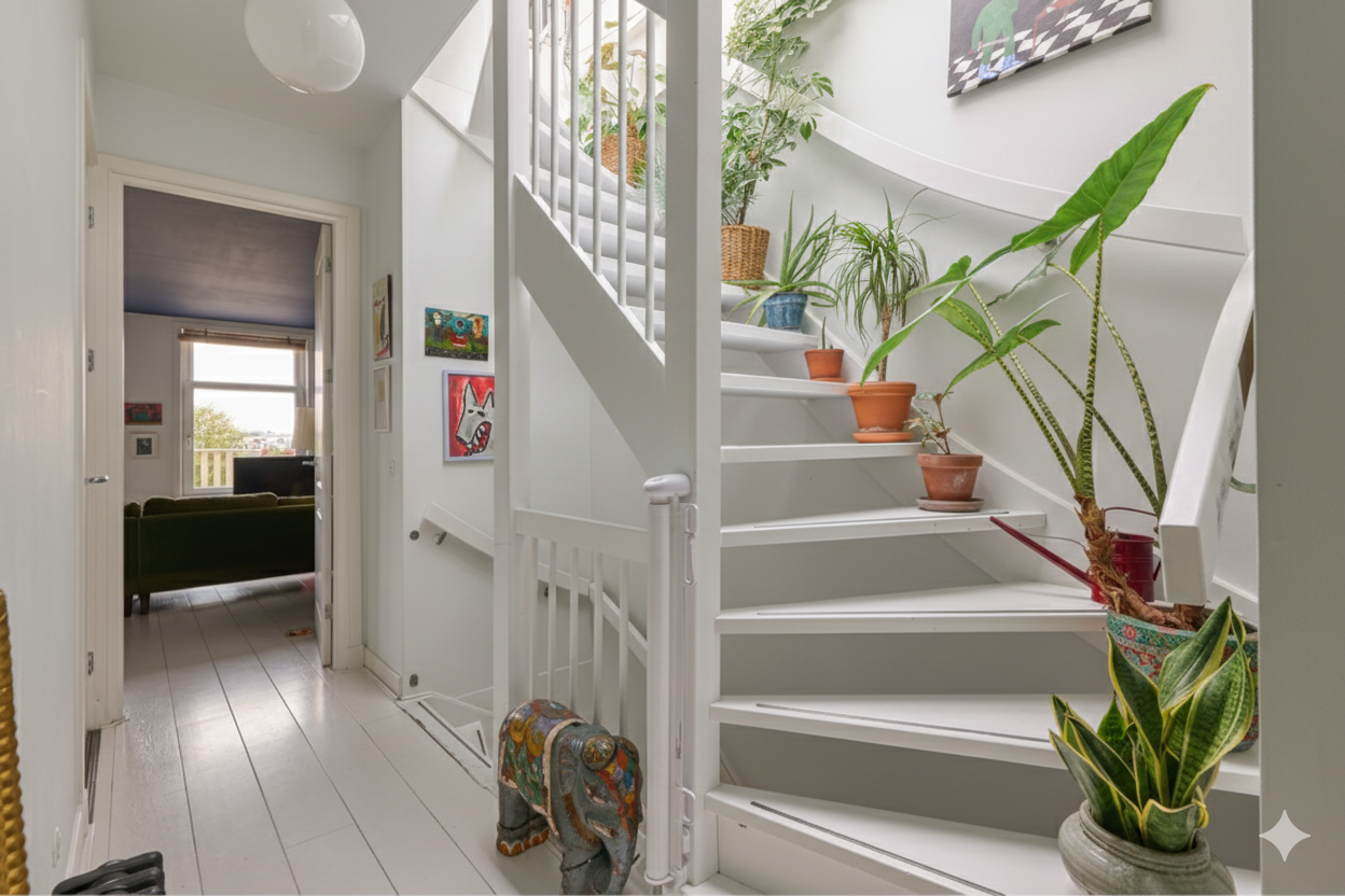 Entreehal met garderobekast en trap naar de woonverdieping.