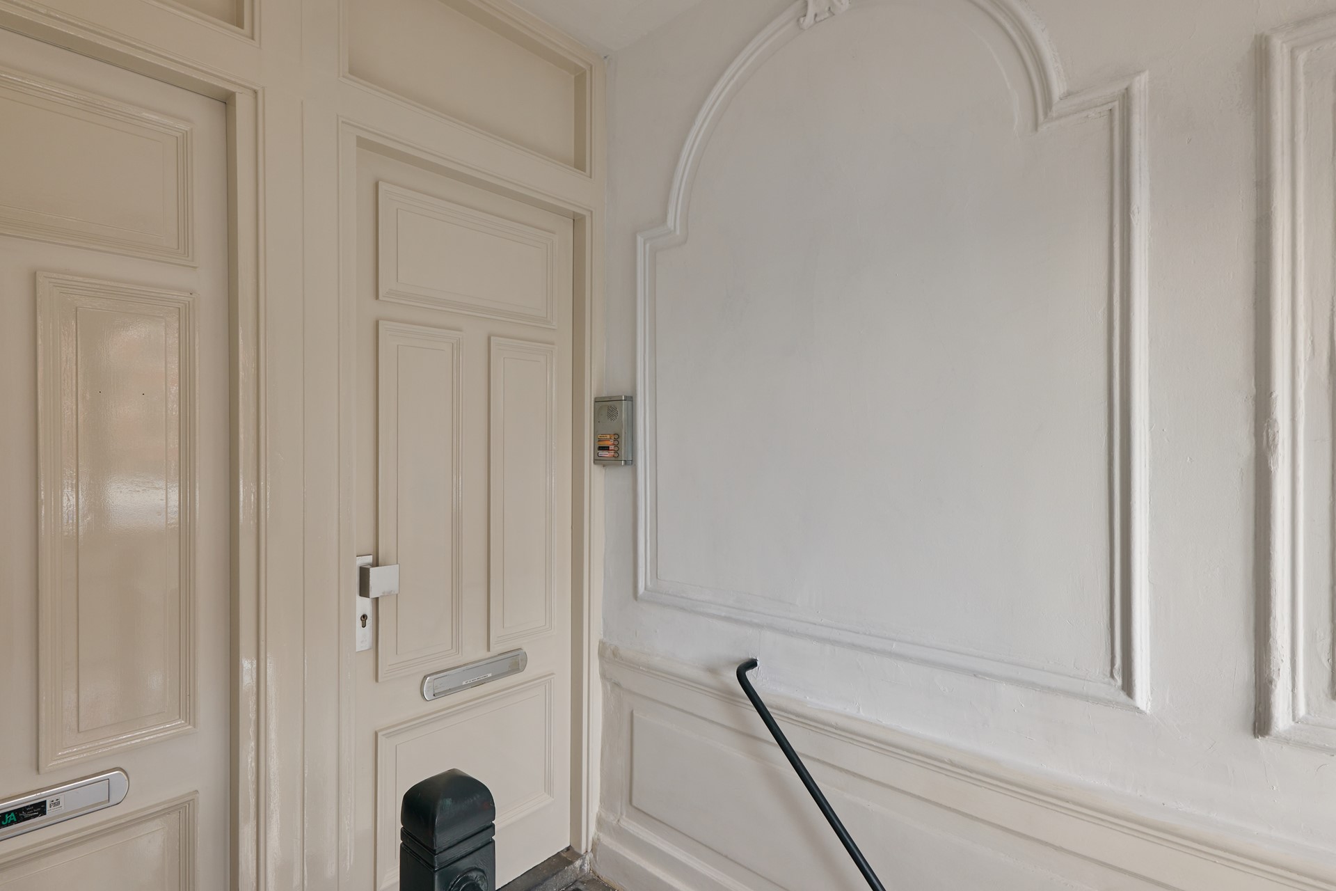 Gemeenschappelijke entree met klassiek stenen opgang en trappenhuis naar de vijfde verdieping.