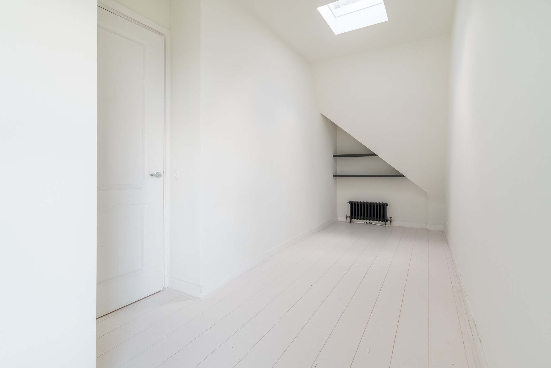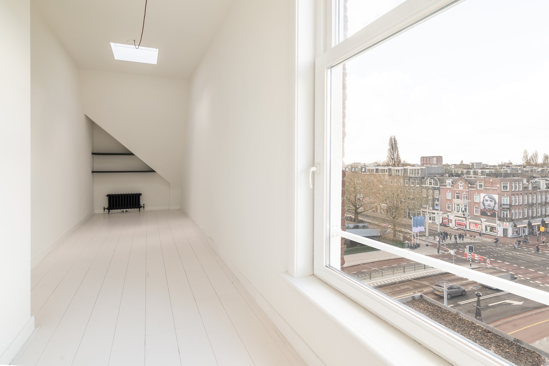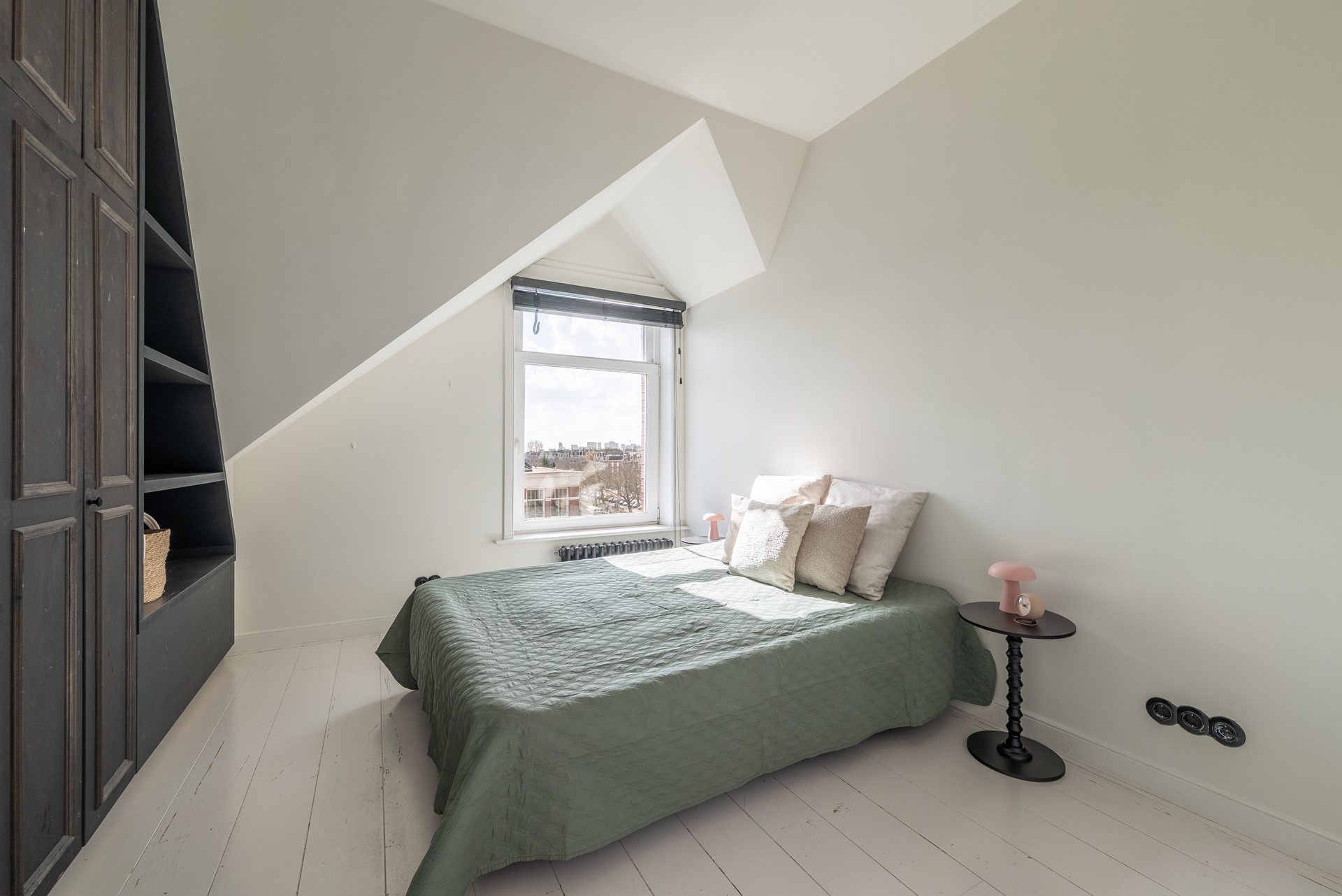In deze kamer is er een dakraam geplaatst voor extra licht en vanuit het hoge raamkozijn kan ook hier de Singelgracht worden bewonderd.