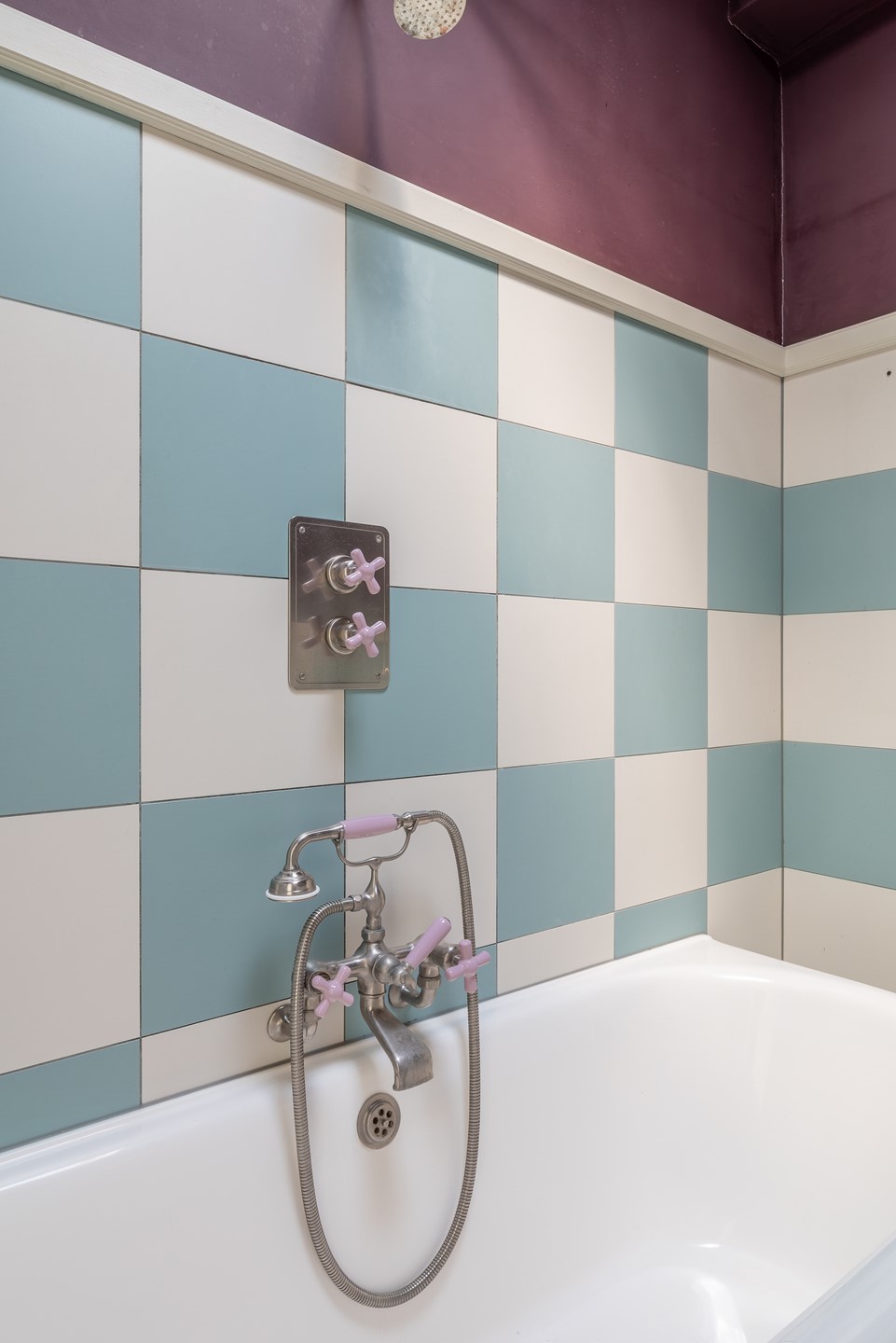 The luxuriously finished bathroom with under-floor heating features unique design elements from 'The Water Monopoly' from the United Kingdom. The bathtub, model 'Soho', is a reproduction of a 1930’s French double-ended bathtub, embodying the sleekness and glamour of early 20th century design and has space for two people comfortably. The sink, taps and shower head are also from 'The Water Monopoly'. The bathroom has a skylight that provides natural light. The Bert & May wall and floor tiles provide a complementary aesthetic.