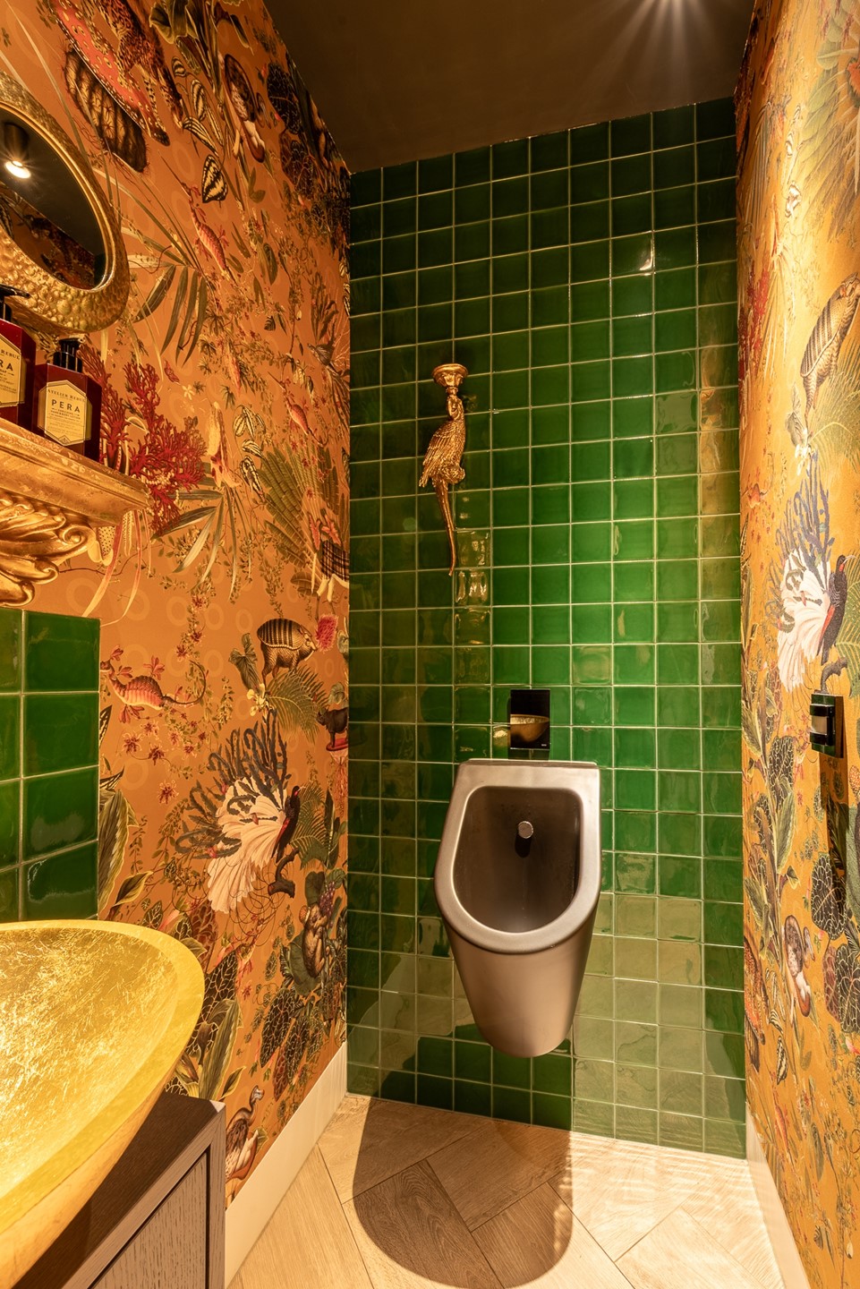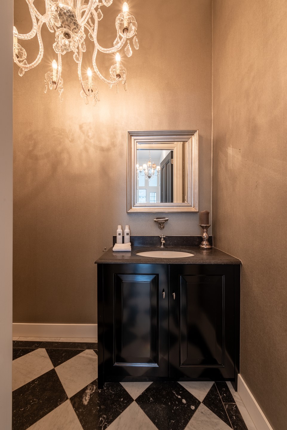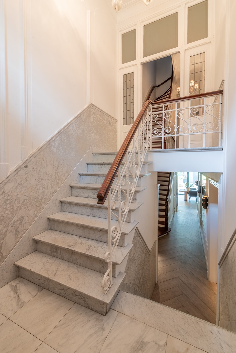 De ruime hal wordt gekenmerkt door een handgeblazen kroonluchter uit Venetië, marmeren wanden, traptreden en de klassieke ornamenten.