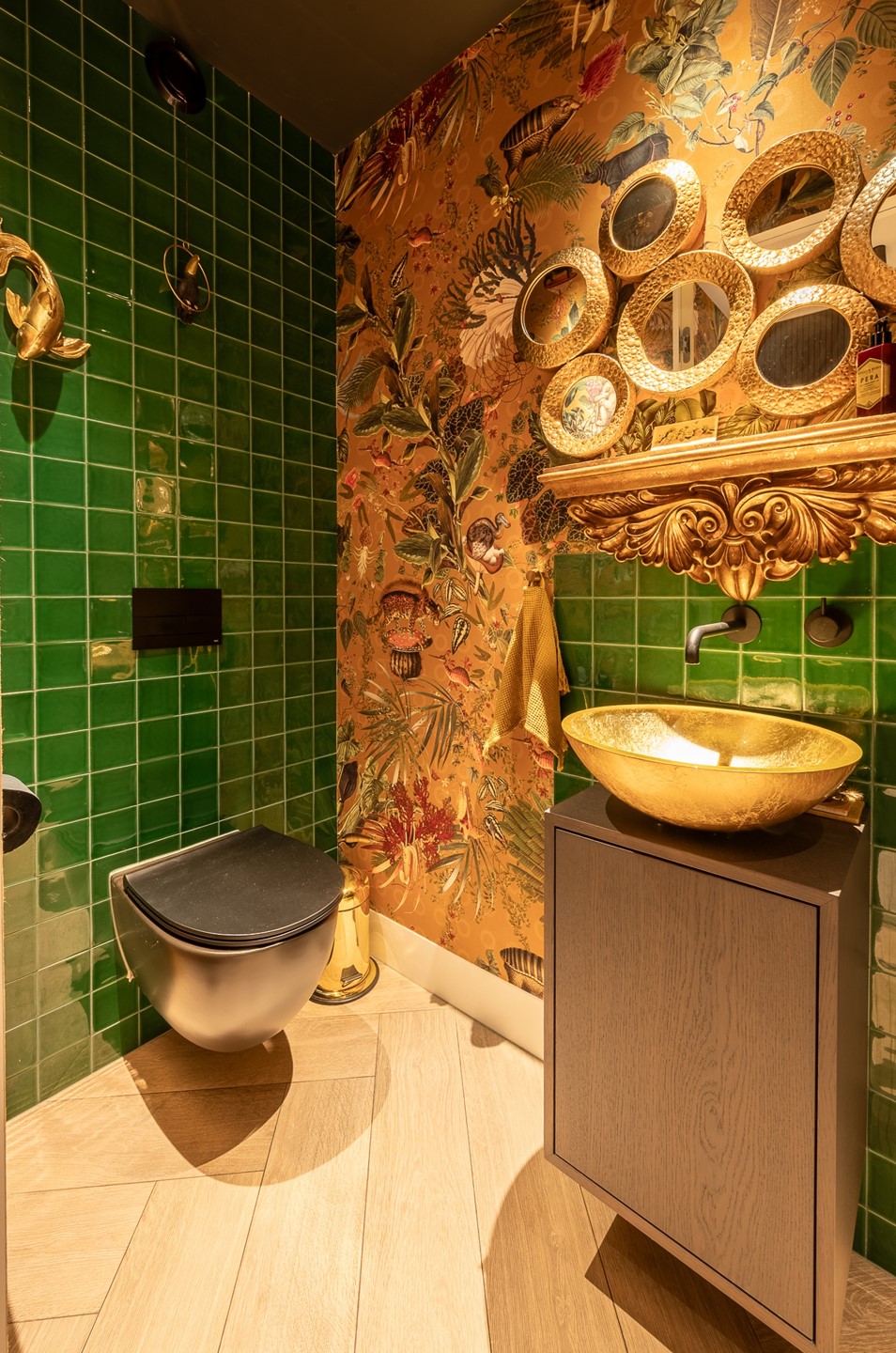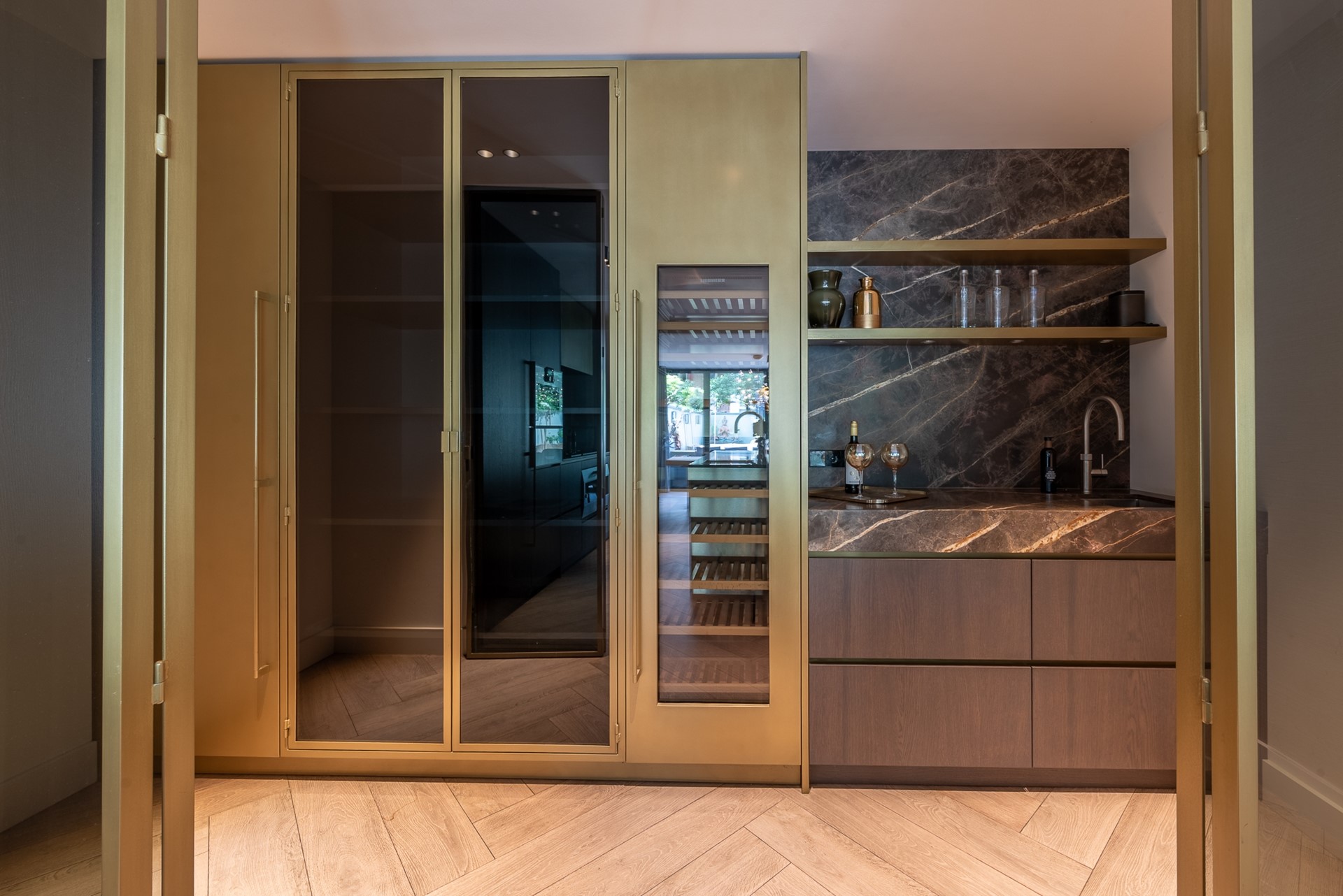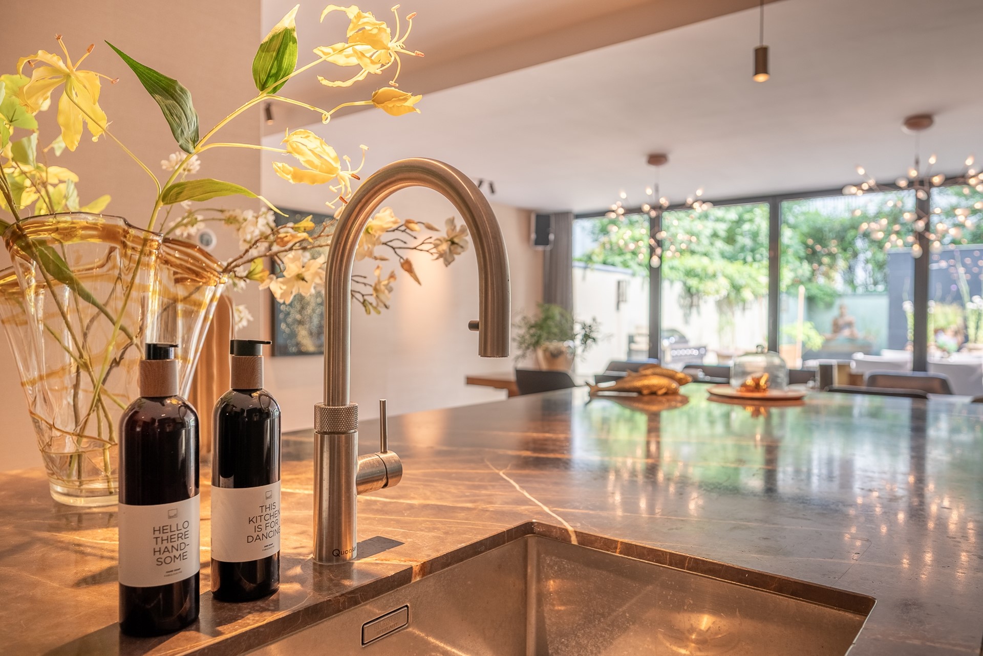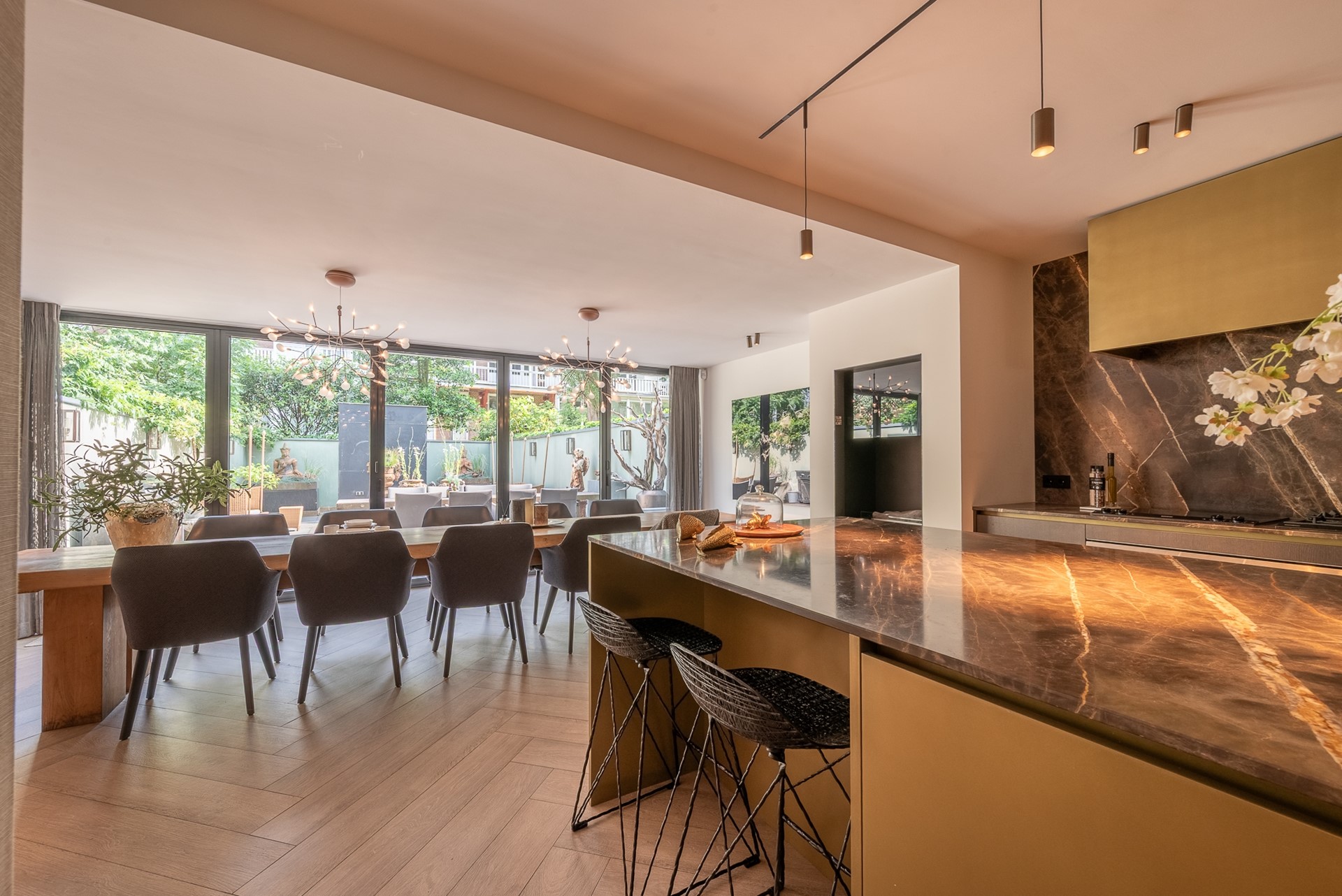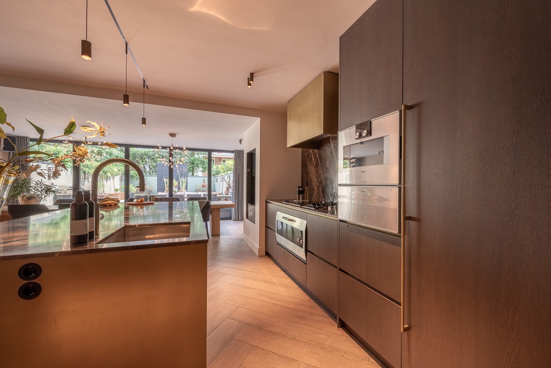 De keuken is uitgerust met inbouwapparatuur waaronder een Gaggenau oven en kookplaat, Liebherr koelkast/wijnklimaatkast en twee Quooker kranen voor heet en bruiswater. Natuurstenen aanrechtblad en een breakfast bar aan het spoeleiland geven de keuken een warme en elegante uitstraling.