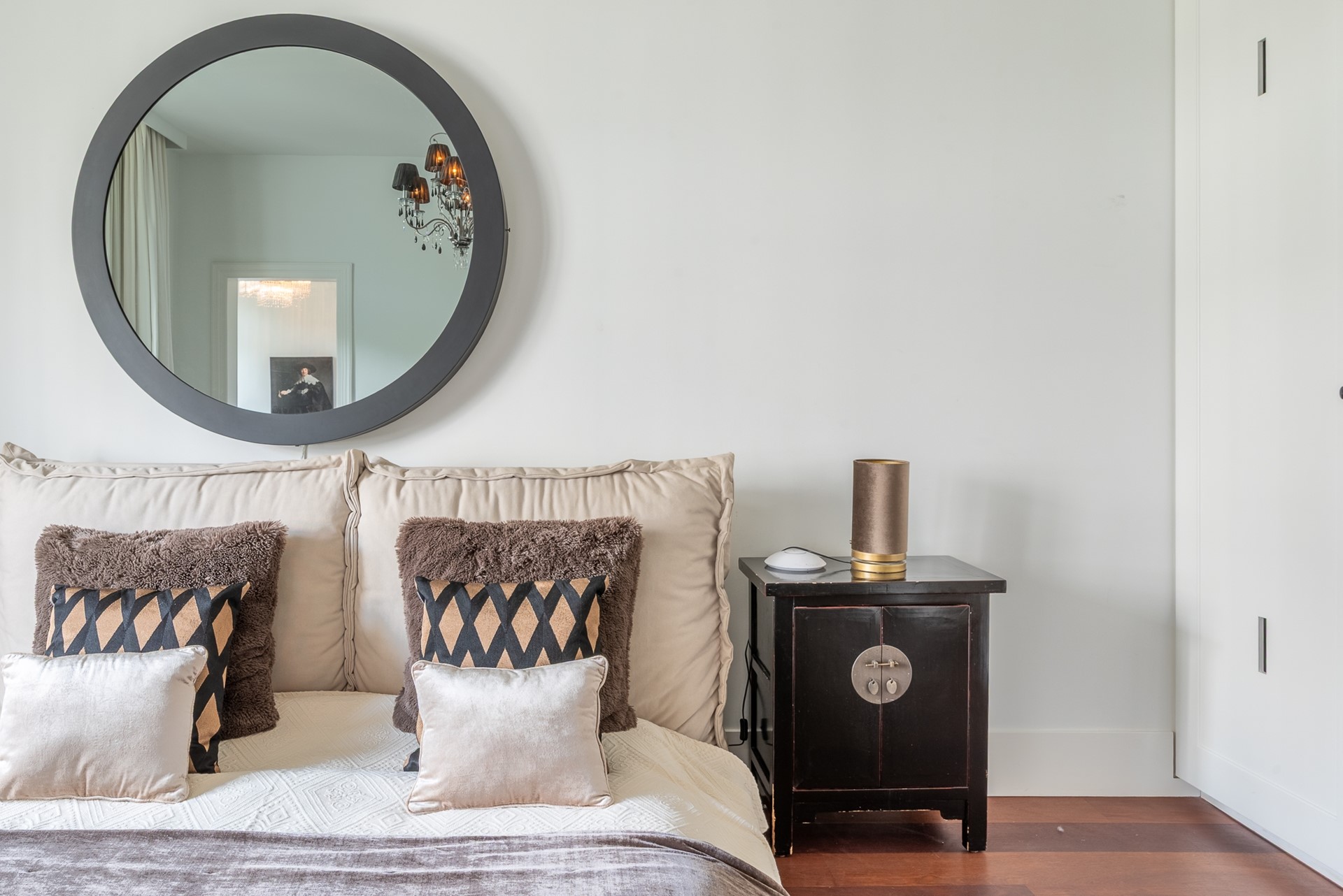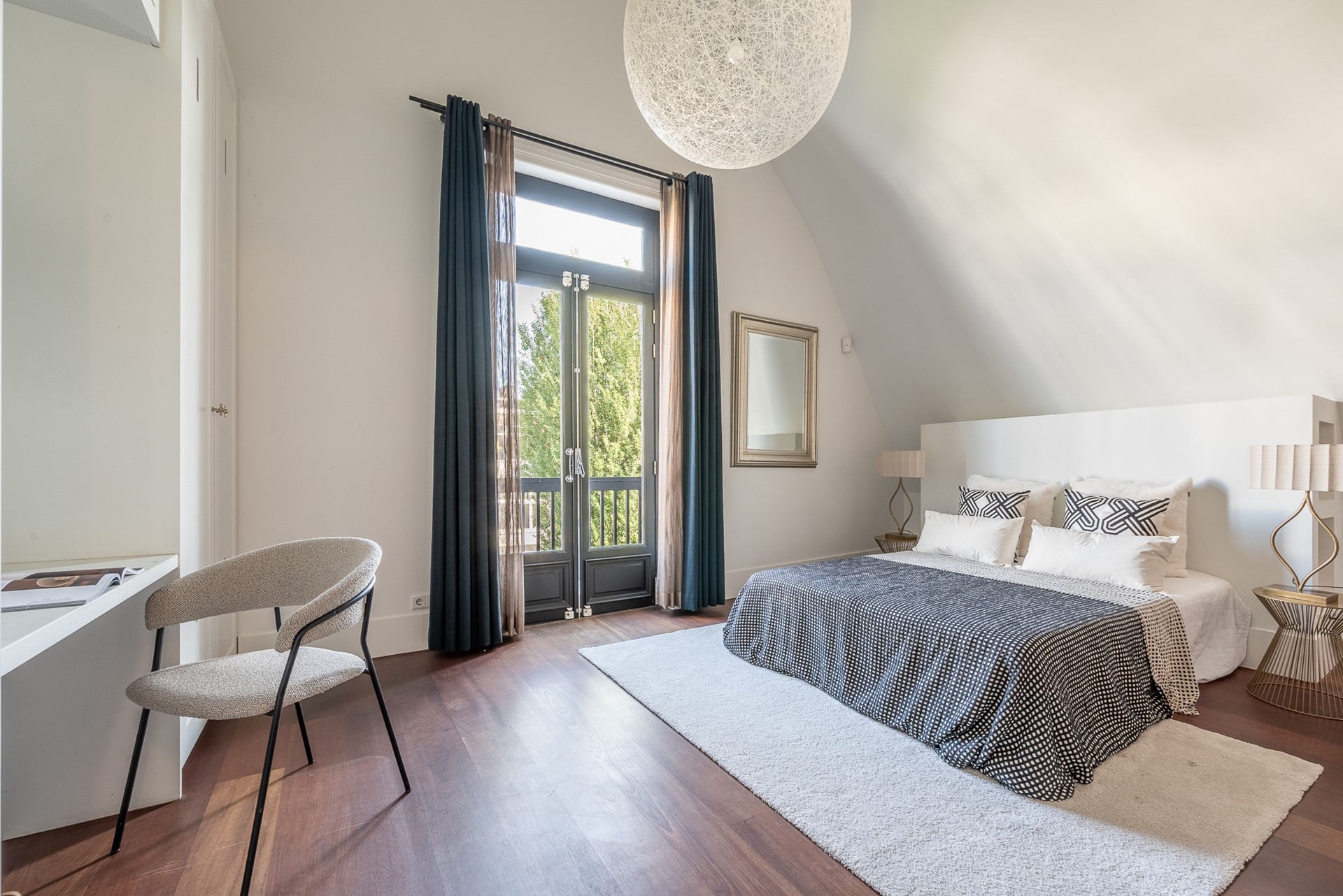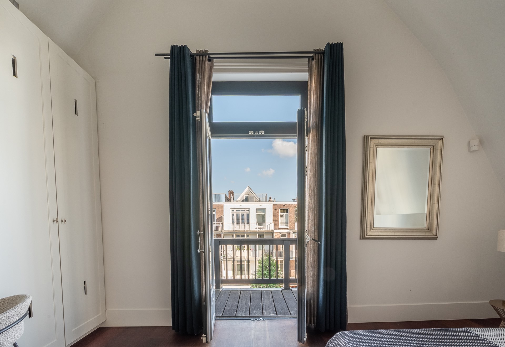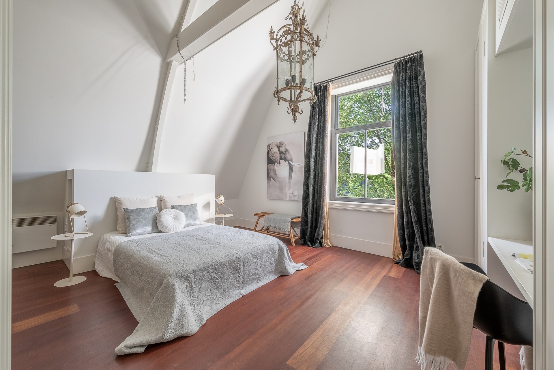 Deze gehele verdieping is ingericht als master suite met alle bijbehorende voorzieningen. Het slaapgedeelte aan de achterzijde beschikt over dubbele deuren die uitkomen op een balkon met zicht op de tuin. Daarnaast bevindt zich een ruime zijkamer met separaat toilet. De slaapkamer leidt via een open doorgang naar een ruime walk-in kastruimte aan de voorzijde, met aansluitend een zijkamer met extra kastruimte.
