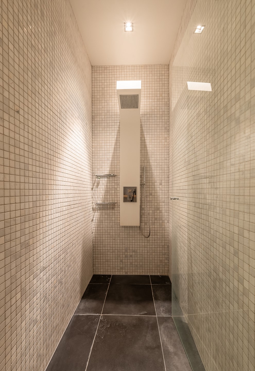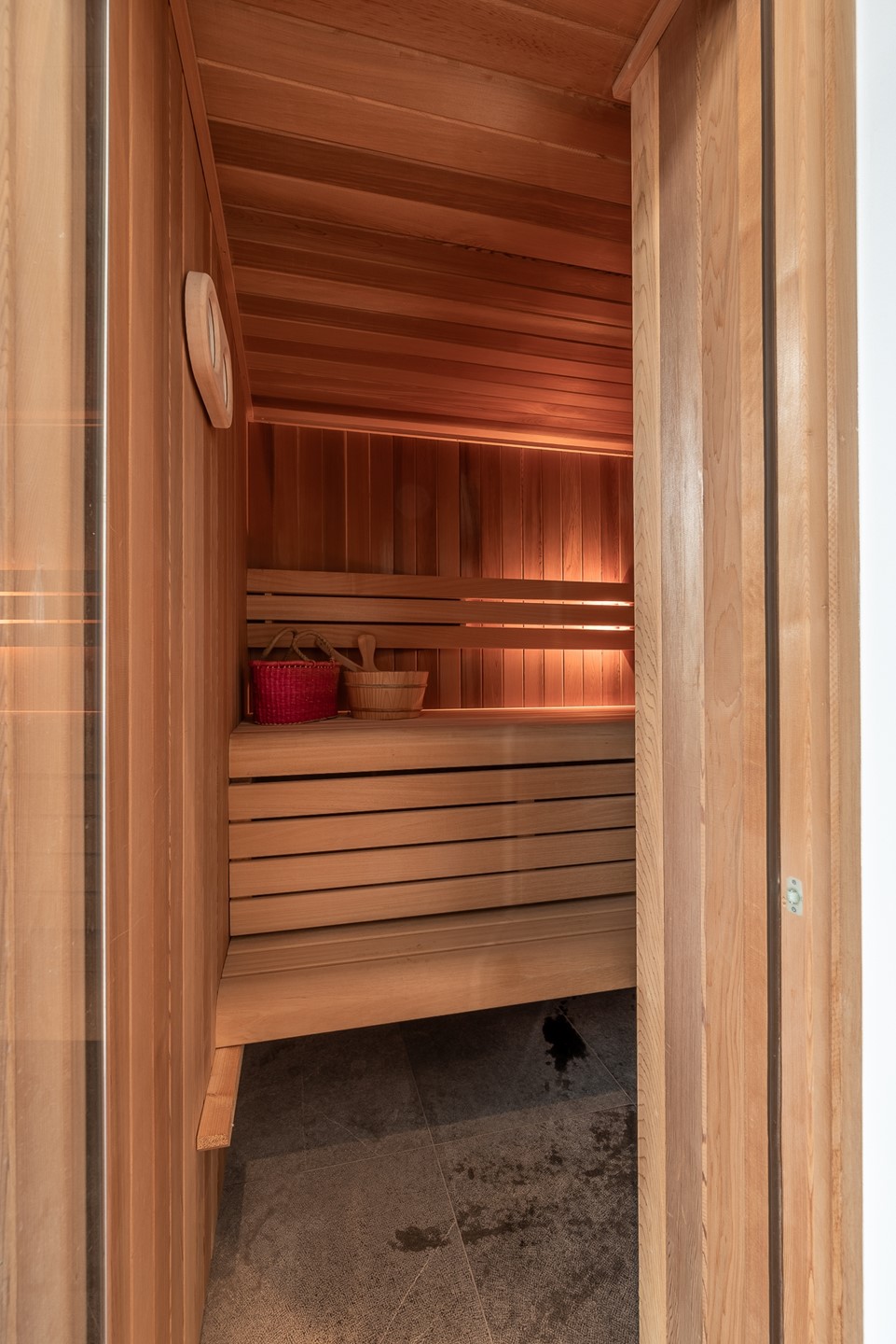 De open badkamer fungeert als verbinding tussen de slaapkamer en de walk-in ruimte en is voorzien van een wastafelmeubel met dubbele wasbak, ruim ligbad, separate inloopdouche en sauna.